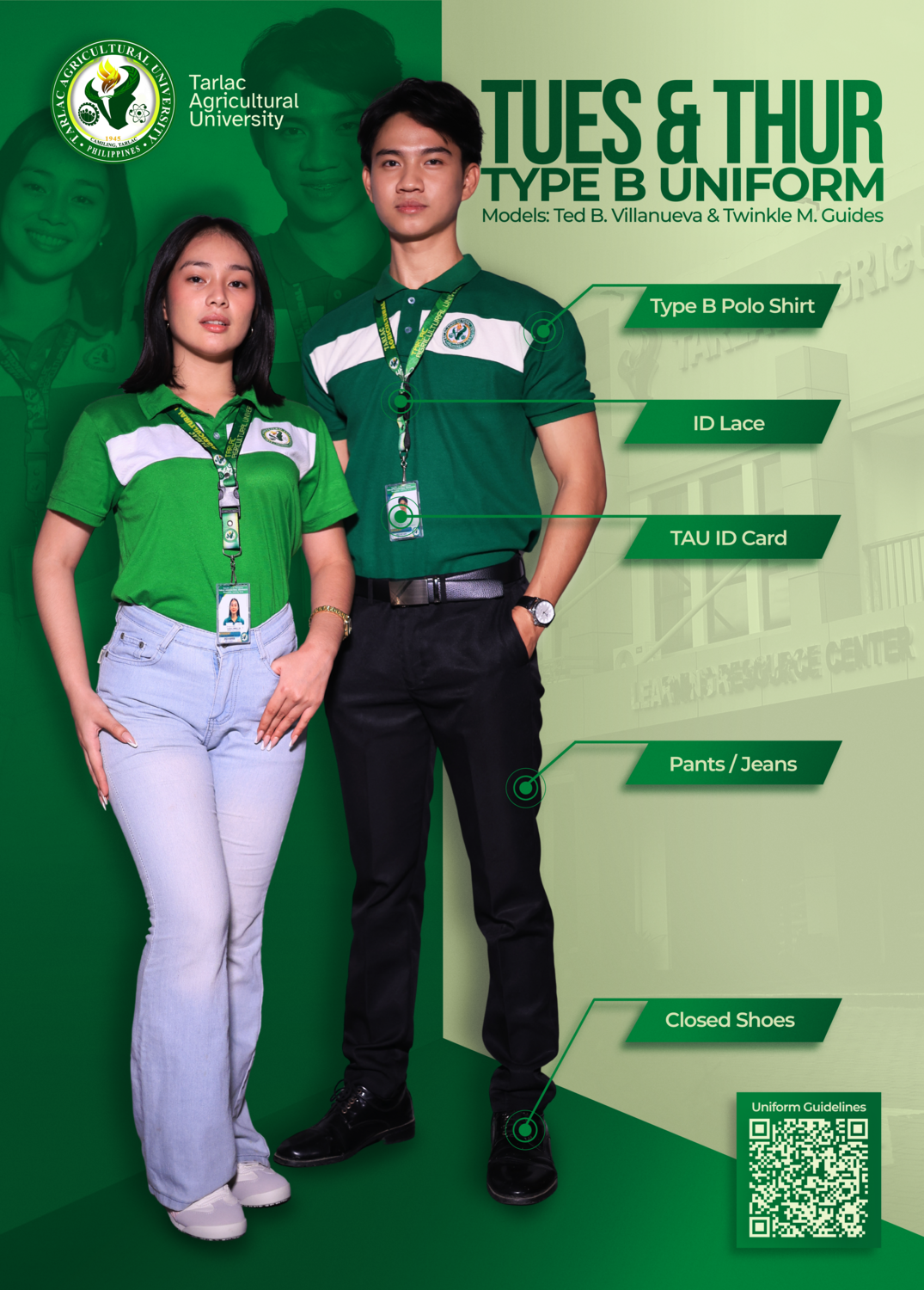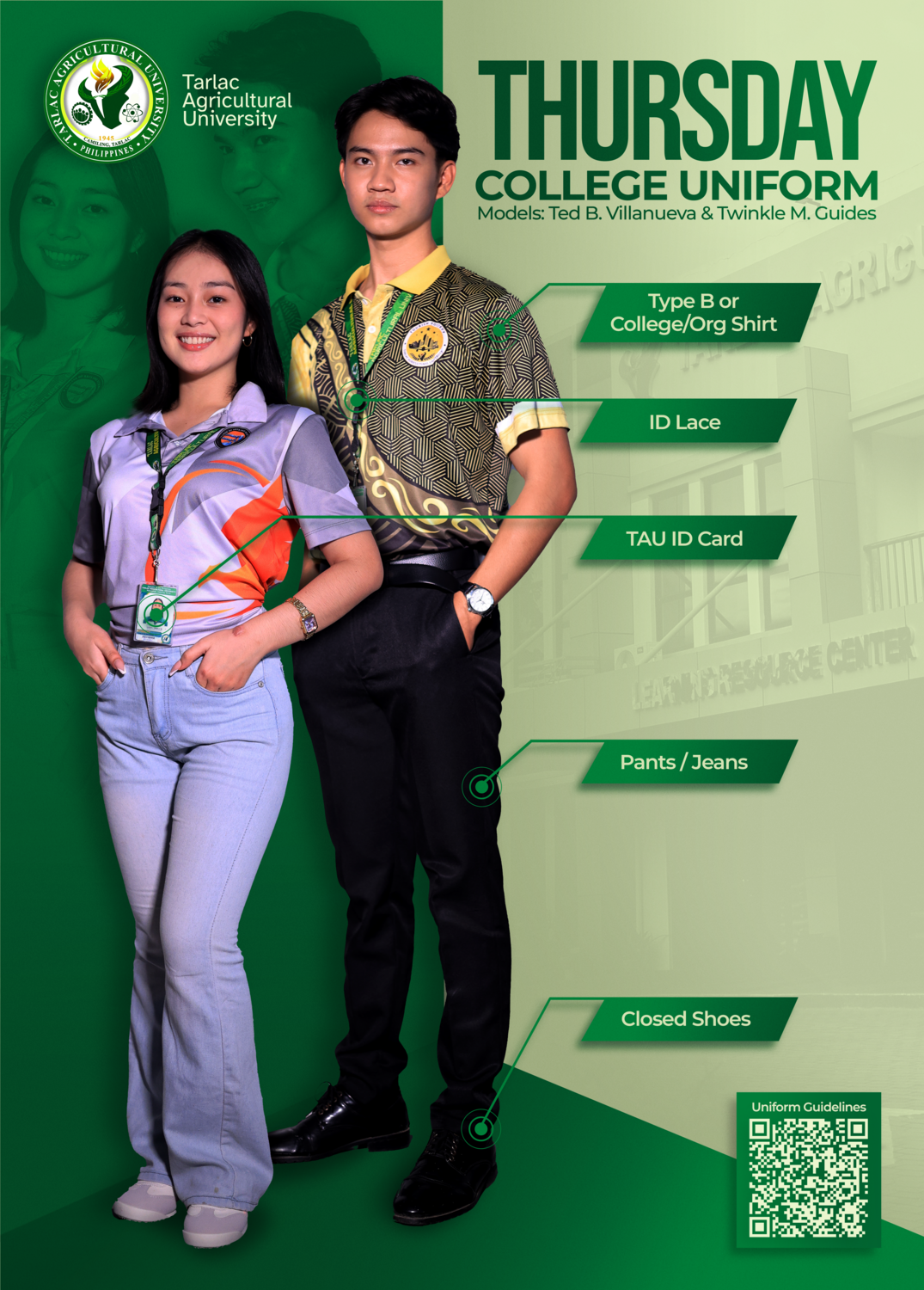 A friendly reminder that the prescribed dress code and uniform schedule are in full effect. Please be guided accordingly and ensure you follow the assigned uniforms for each day. Also, remember that your official TAU Identification Card is required to be worn visibly at all times within the campus.