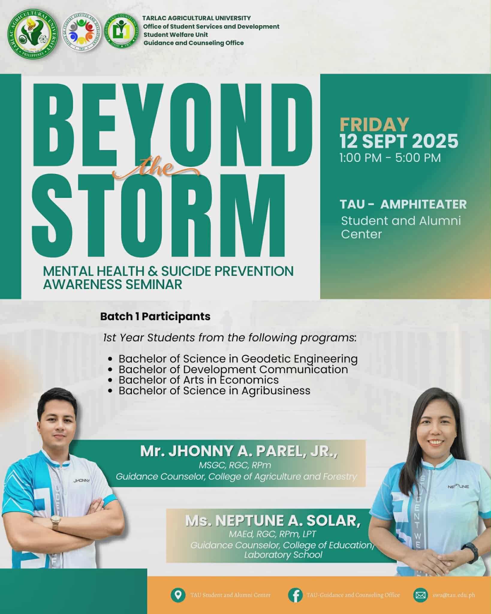 Tarlac Agricultural University (TAU) invites all first-year students (AM: BAS 1, BECED 1; PM: BSGE 1, BSAB 1, AB Econ 1, and BSDC 1) to the Mental Health and Suicide Prevention Awareness Seminar this Friday, 12 September, at the Student and Alumni Center Amphitheater.ย
