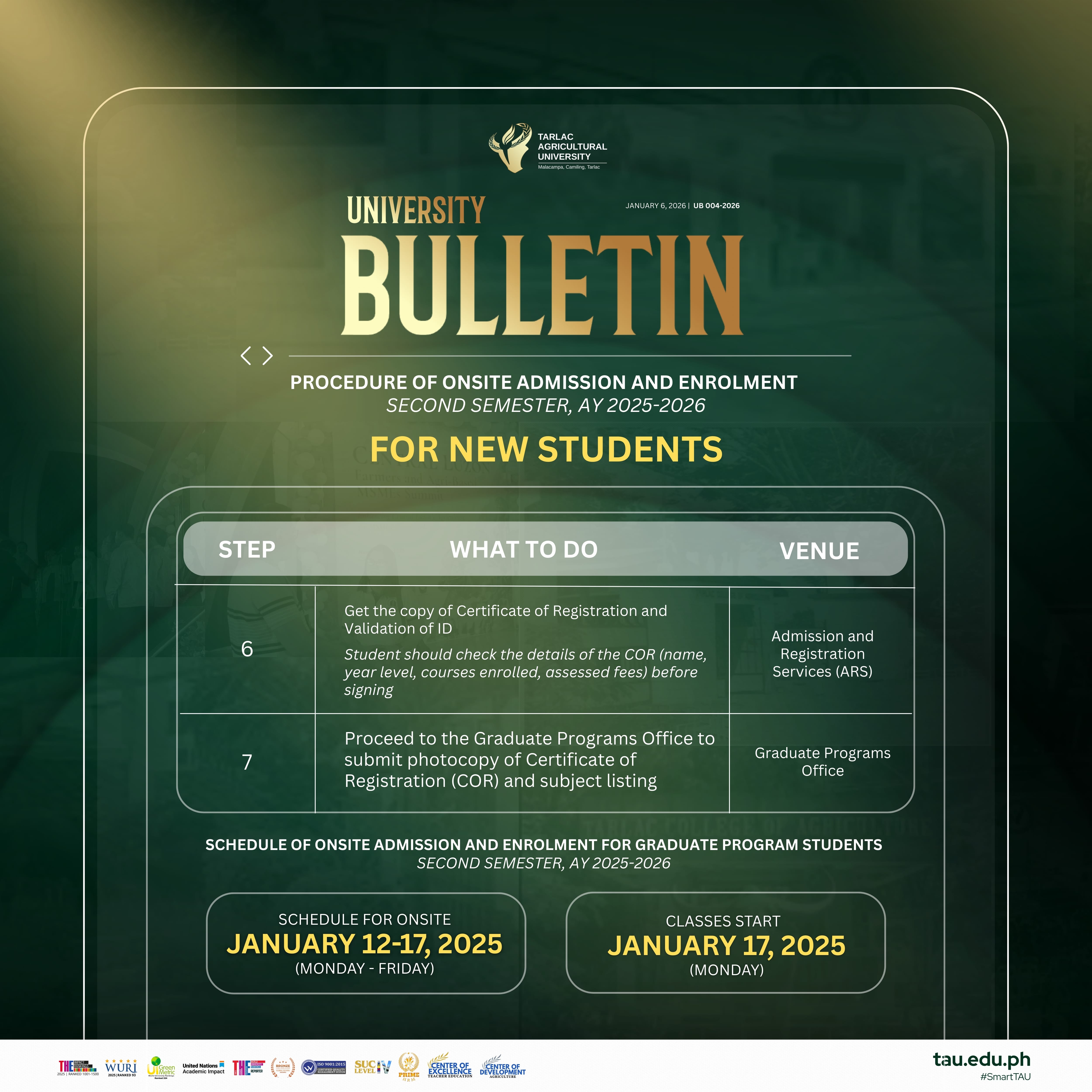 Please take note of your specific steps and required offices. New students begin at ARS Office, while continuing students proceed first to the Graduate Programs Office. Remember to check all details on your Certificate of Registration before signing, and be informed that classes officially begin on 17 January 2026.