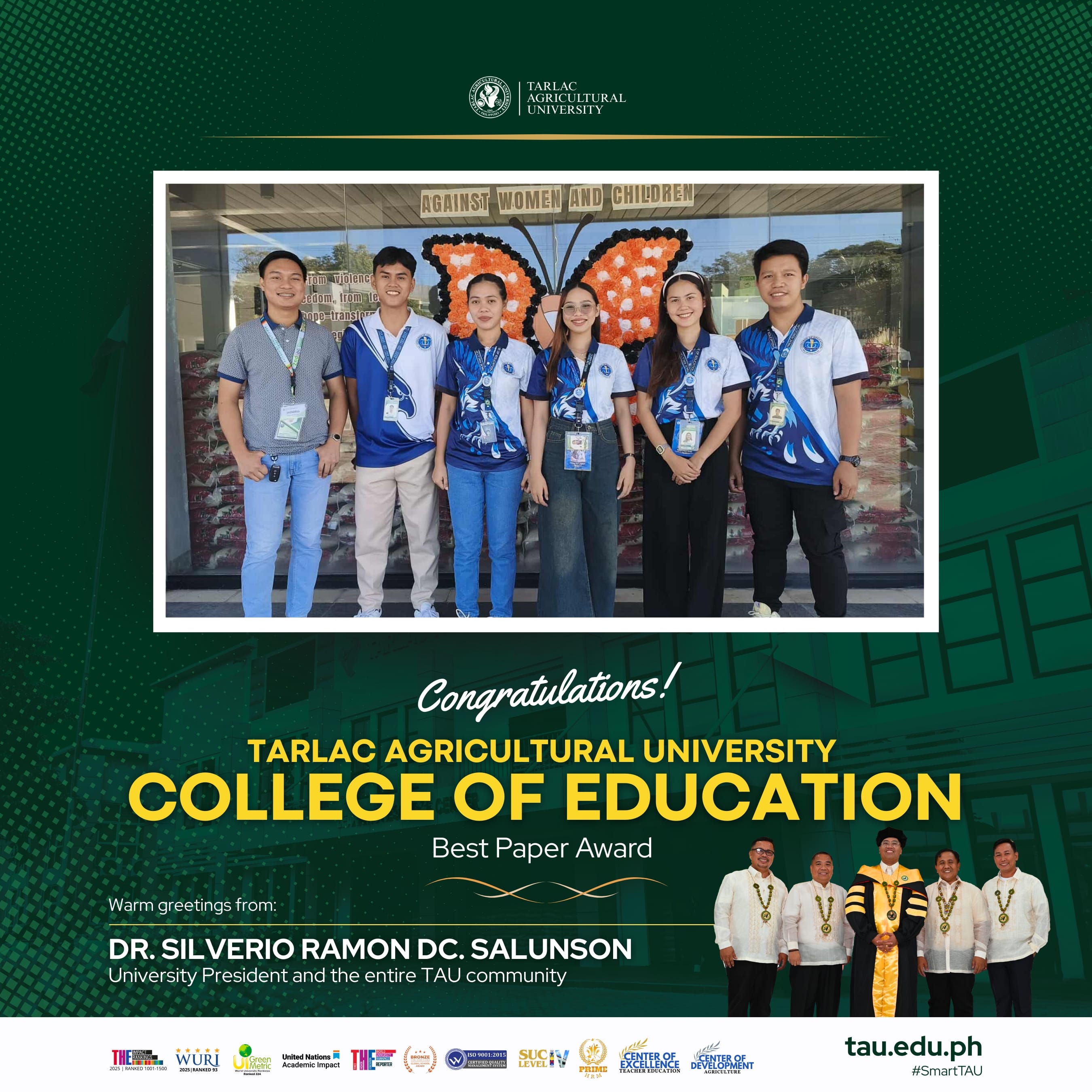 The research team from Tarlac Agricultural University (TAU)ย College of Education (CEd), composed of Princess Jenel L. Sapigao, Hannah Grace R. Braรฑa, Judith B. Corpuz, Marlon Jay G. Tamondong, and Mc Jhovan O. Tolenada, was advised by Mr. Cris Wendell O. Pinto.ย