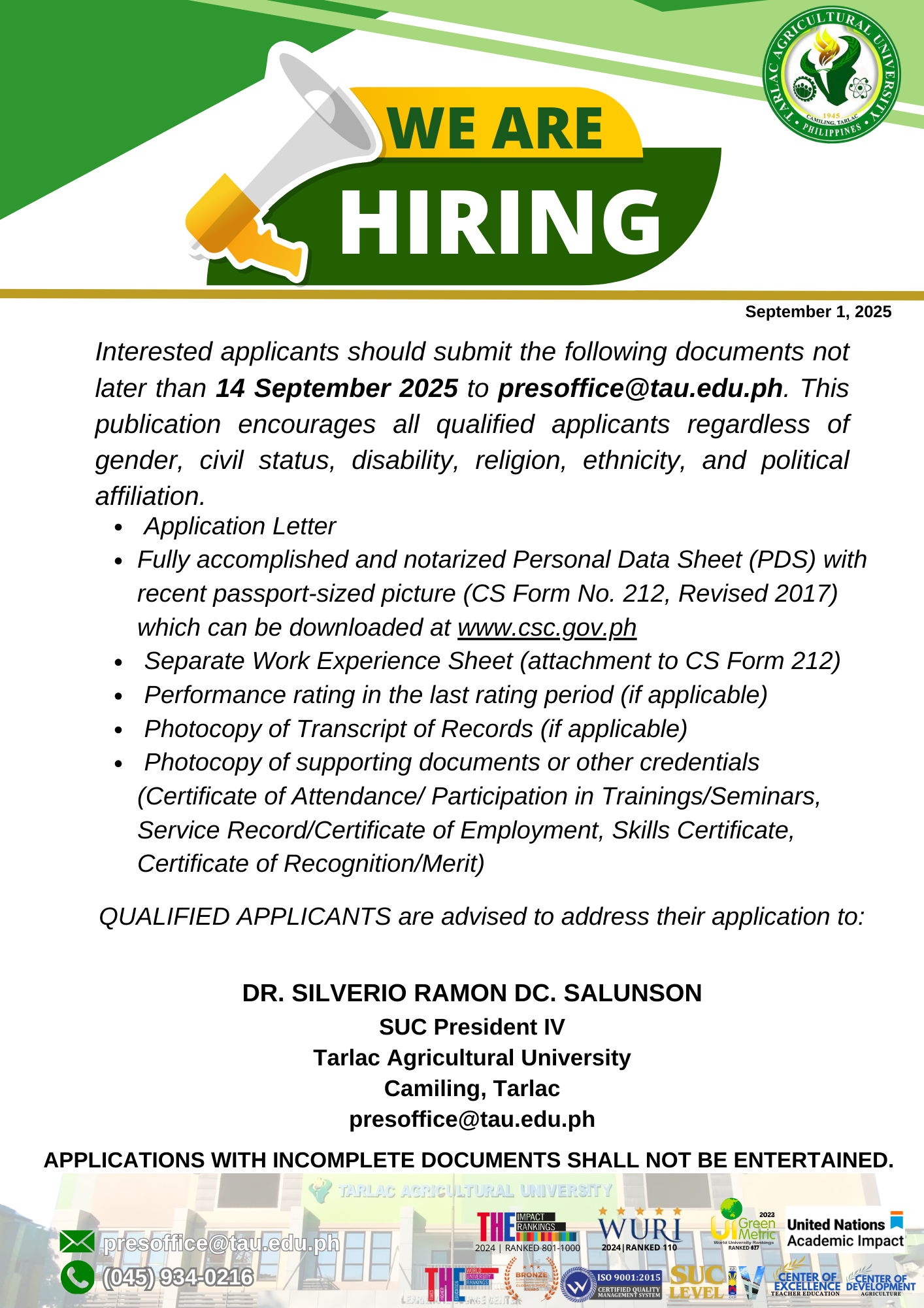 Applicants who are interested and willing to join TAUβs growing family are encouraged to submit their application letter along with the necessary documents addressed to Dr. Silverio Ramon DC. Salunson, SUC President IV, no later than 14 September 2025.