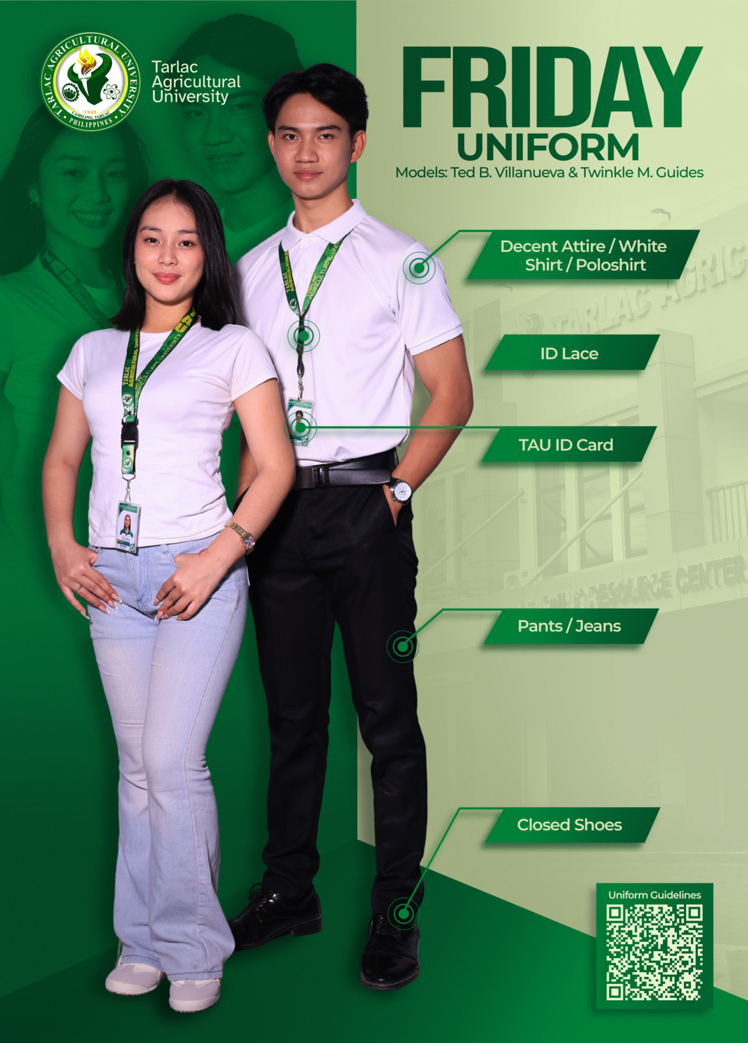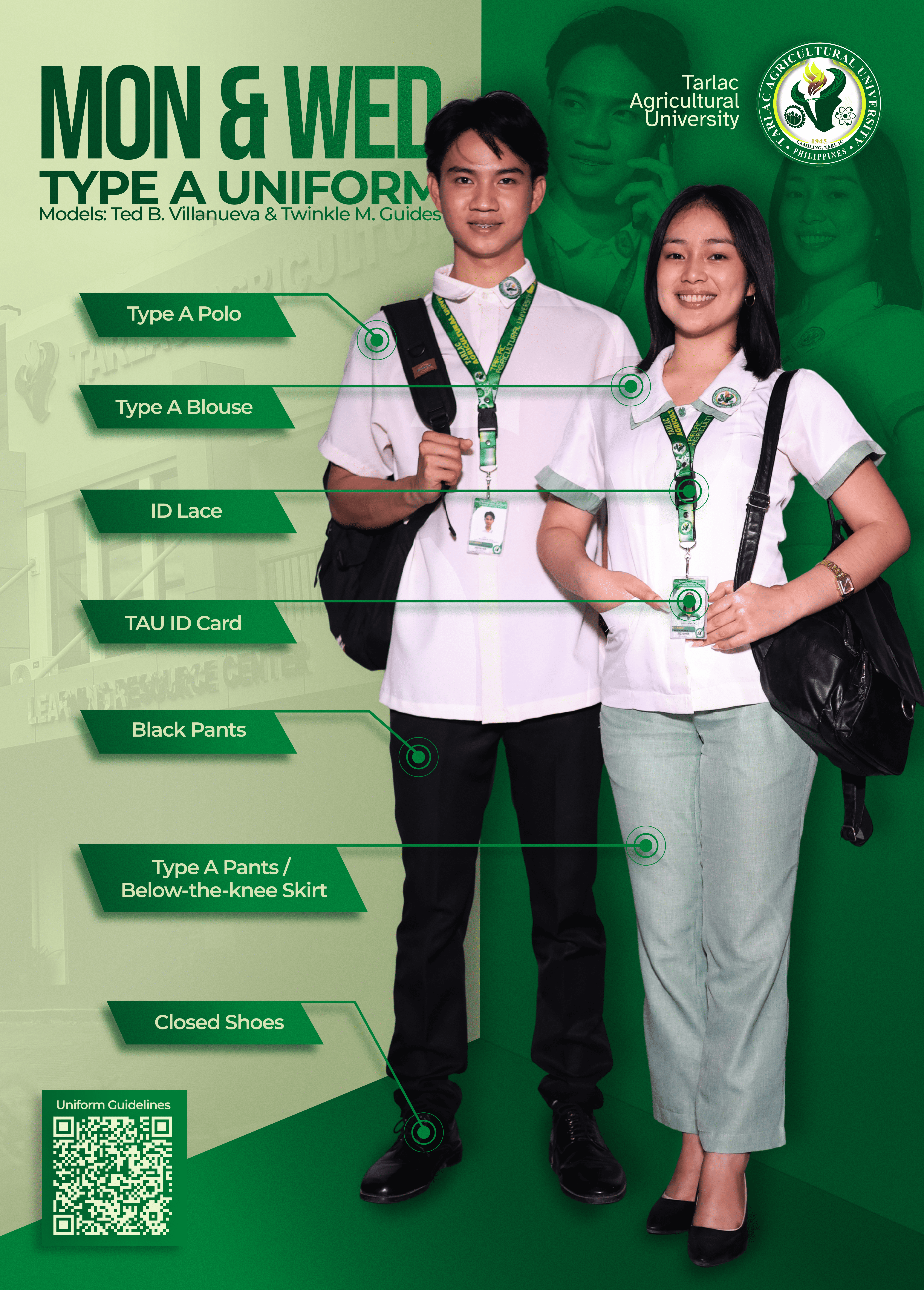 A friendly reminder that the prescribed dress code and uniform schedule are in full effect. Please be guided accordingly and ensure you follow the assigned uniforms for each day. Also, remember that your official TAU Identification Card is required to be worn visibly at all times within the campus.