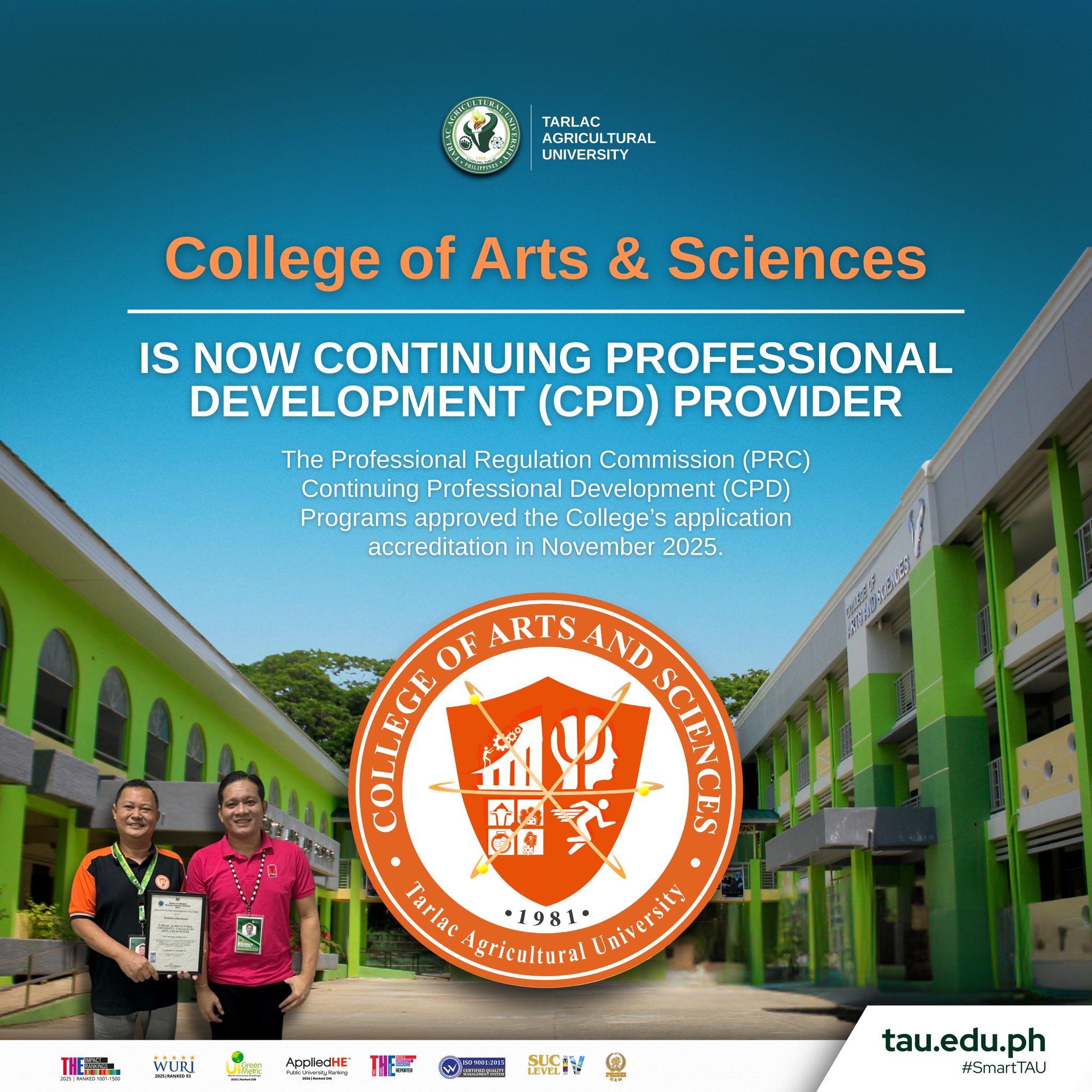 Pursuant to the Professional Regulation Commissionβs (PRC) guidelines on Continuing Professional Development (CPD), the College of Arts and Sciences (CAS) of Tarlac Agricultural University (TAU) is formally awarded the authority to implement CPD program offerings.