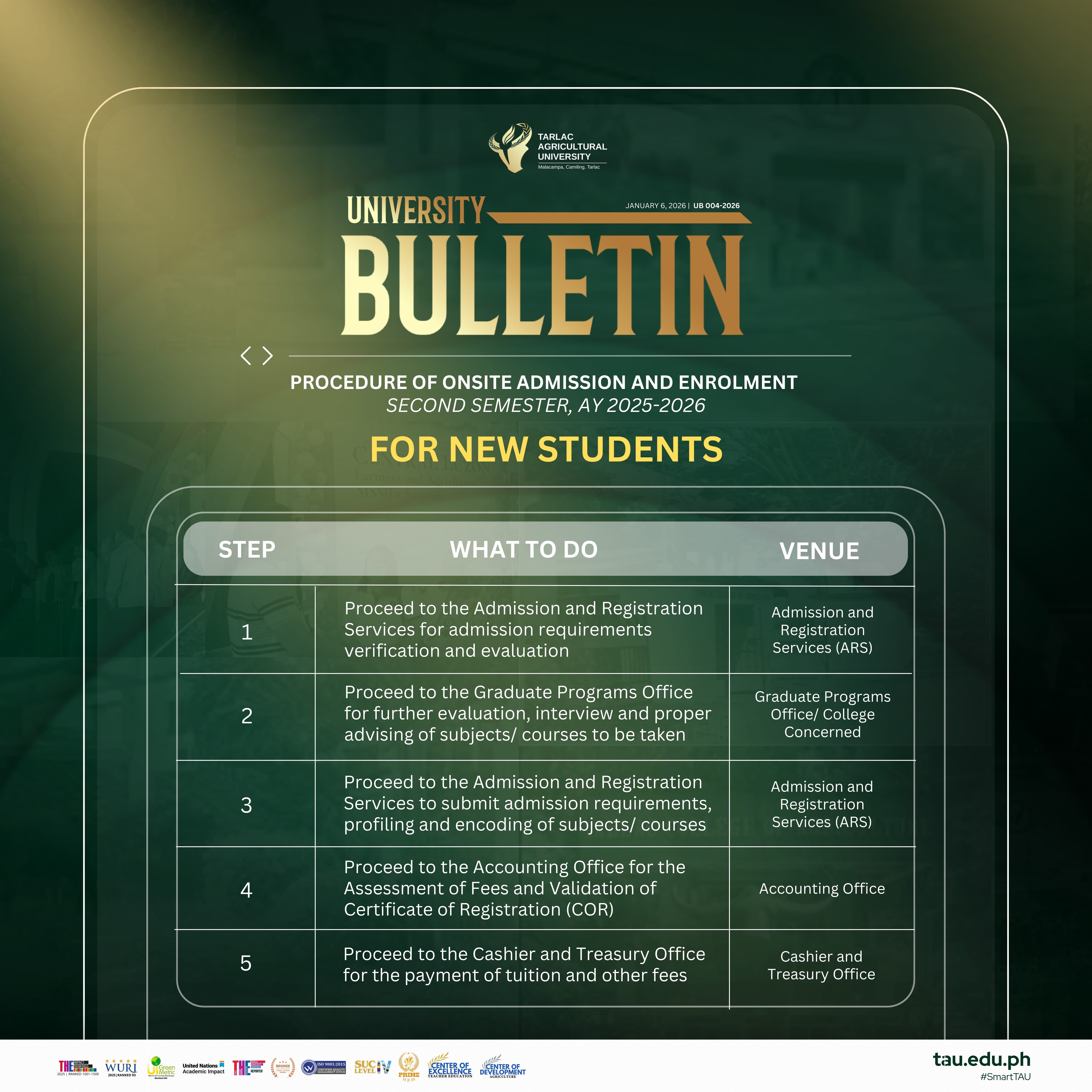 Please take note of your specific steps and required offices. New students begin at ARS Office, while continuing students proceed first to the Graduate Programs Office. Remember to check all details on your Certificate of Registration before signing, and be informed that classes officially begin on 17 January 2026.