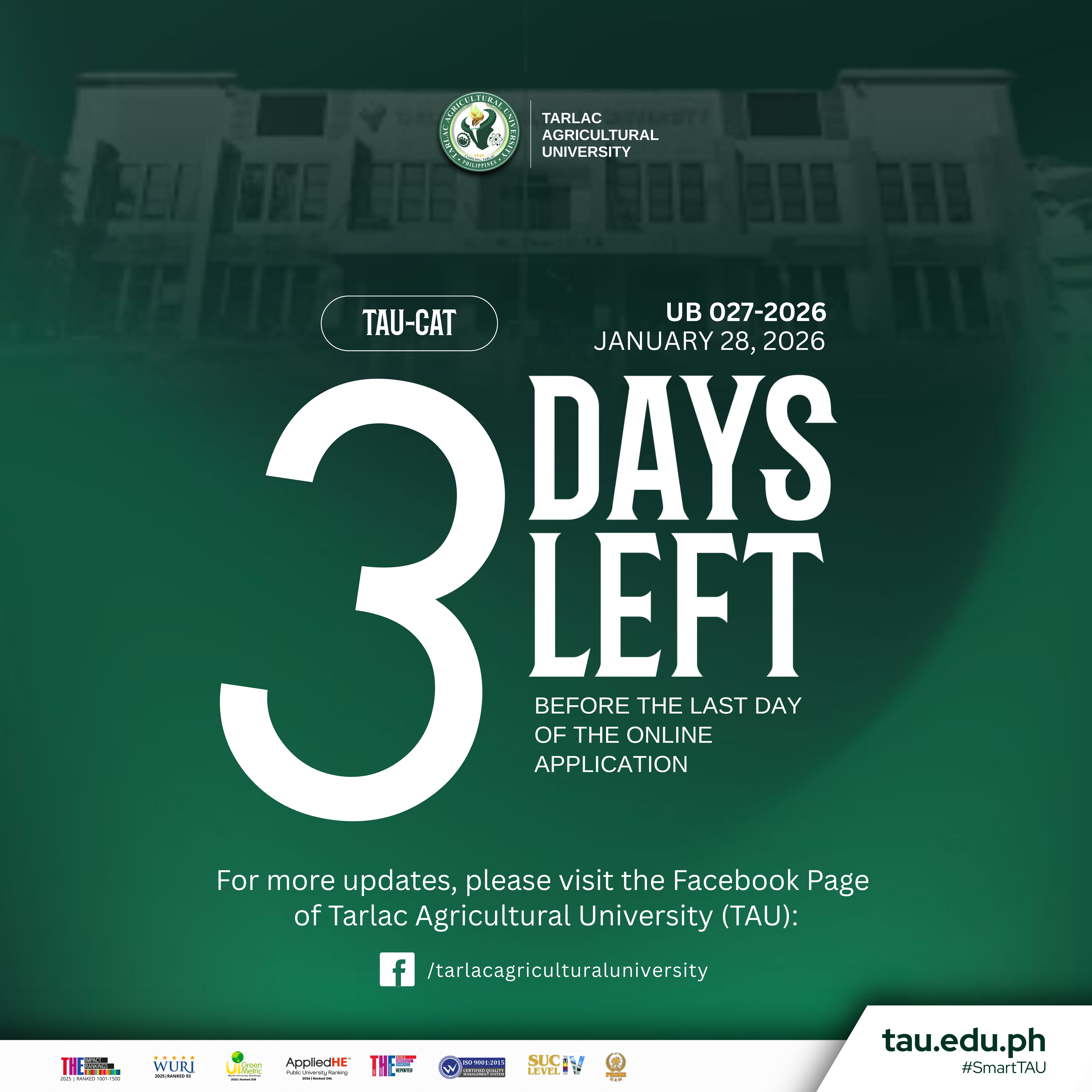 The TAU-ARS reminds that the application period for the Tarlac Agricultural University College Admission Test (TAU-CAT) is nearing its close. Applicants are advised to review their submissions and ensure that all required information and documents are complete and properly uploaded before the deadline on 31 January.