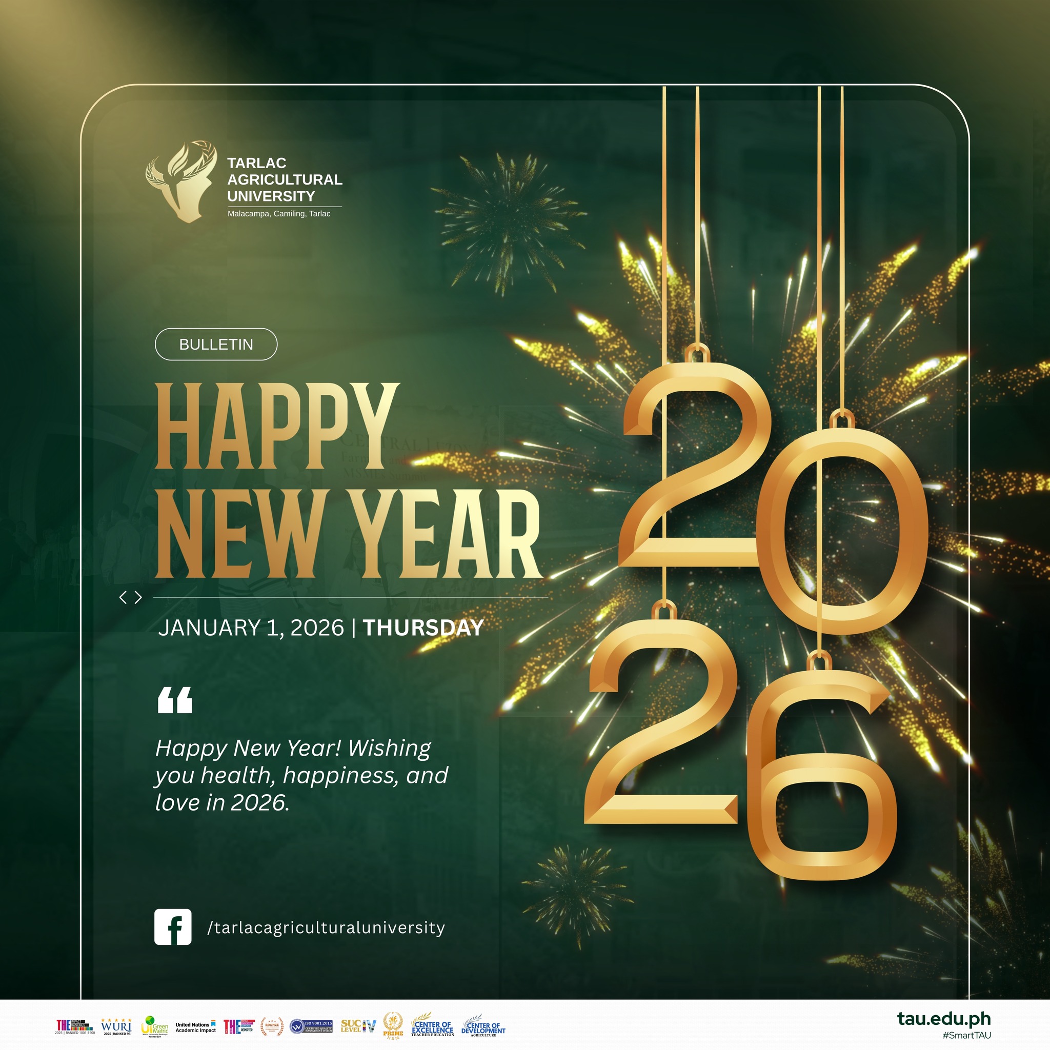 As we reflect on the year now passing, we recognize that 2025 often felt like a series of disruptive pyrotechnics, sudden bursts that briefly lit up a landscape marked by natural calamities, personal losses, and collective hardship. Yet in the quiet that followed each shock, the search for peace became essential. Here at Tarlac Agricultural University (TAU), we found a family that reminded us of the constants we hold dear: our resilience, our compassion, and our interconnectedness.