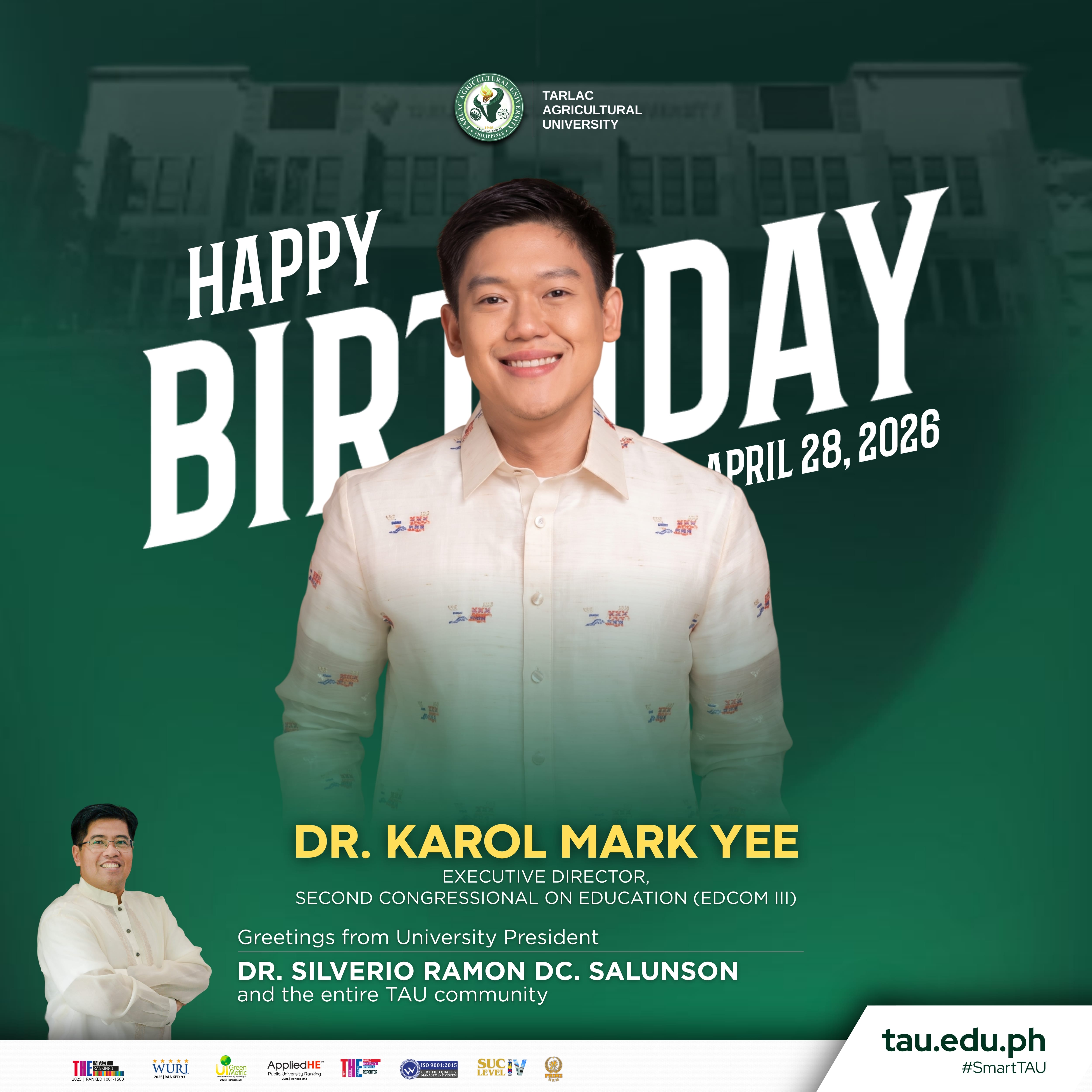 Greetings from University President ๐๐ซ. ๐๐ข๐ฅ๐ฏ๐๐ซ๐ข๐จ ๐๐๐ฆ๐จ๐ง ๐๐. ๐๐๐ฅ๐ฎ๐ง๐ฌ๐จ๐ง and the ๐๐ง๐ญ๐ข๐ซ๐ ๐๐๐ ๐๐จ๐ฆ๐ฆ๐ฎ๐ง๐ข๐ญ๐ฒ