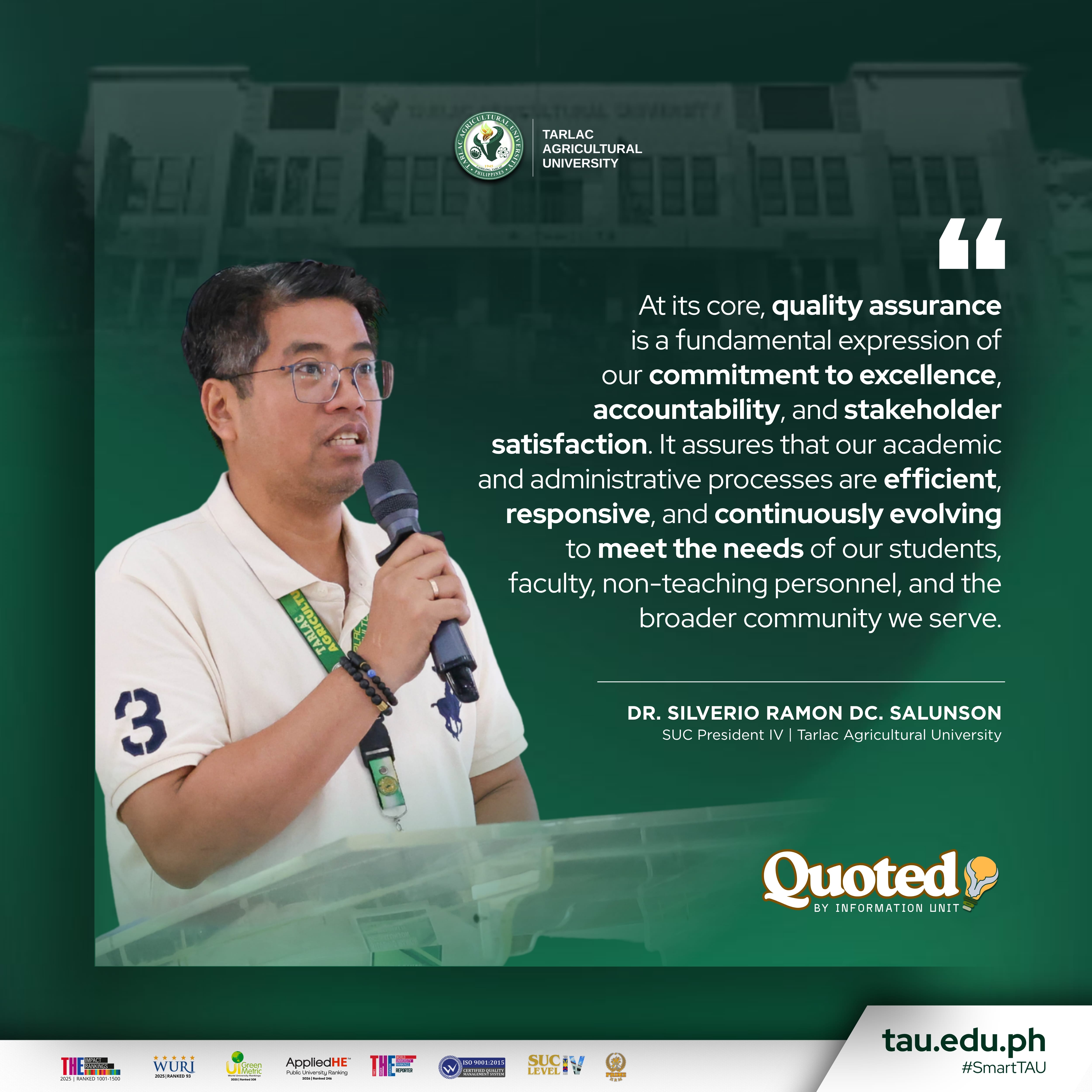 Asserting that quality assurance is the cornerstone of excellence, accountability, and stakeholder satisfaction, Dr. Silverio Ramon DC. Salunson, President of Tarlac Agricultural University (TAU), expresses his full support for the seminar-workshop, βUnderstanding ISO 9001:2015 Requirements, Principles, and Application as Internal Quality Audit Criteria,β held at the AgriTourism Hostel Function Hall on 26 March.