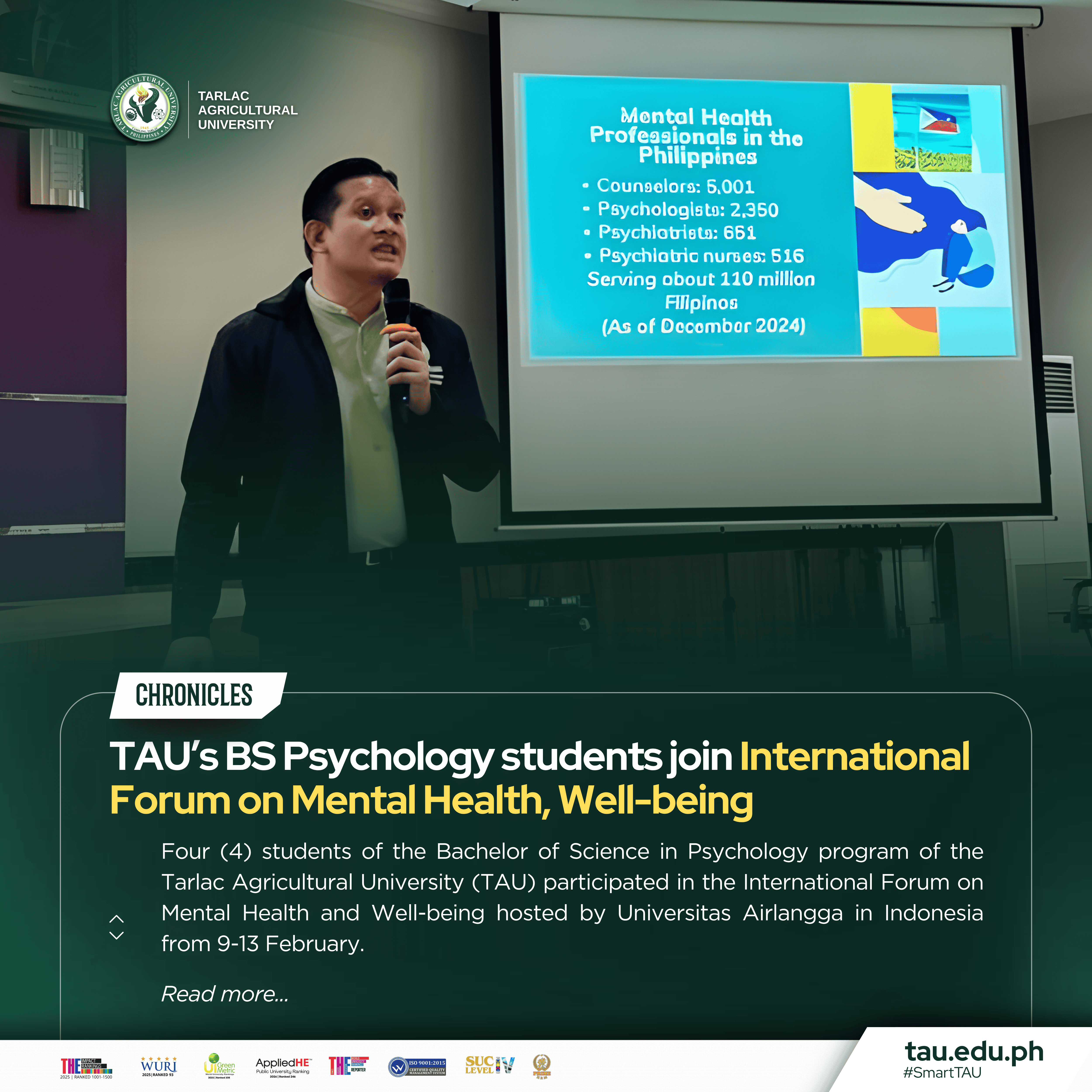 Four (4) students of the Bachelor of Science in Psychology program of the Tarlac Agricultural University (TAU) participated in the International Forum on Mental Health and Well-being hosted by Universitas Airlangga in Indonesia from 9-13 February.
