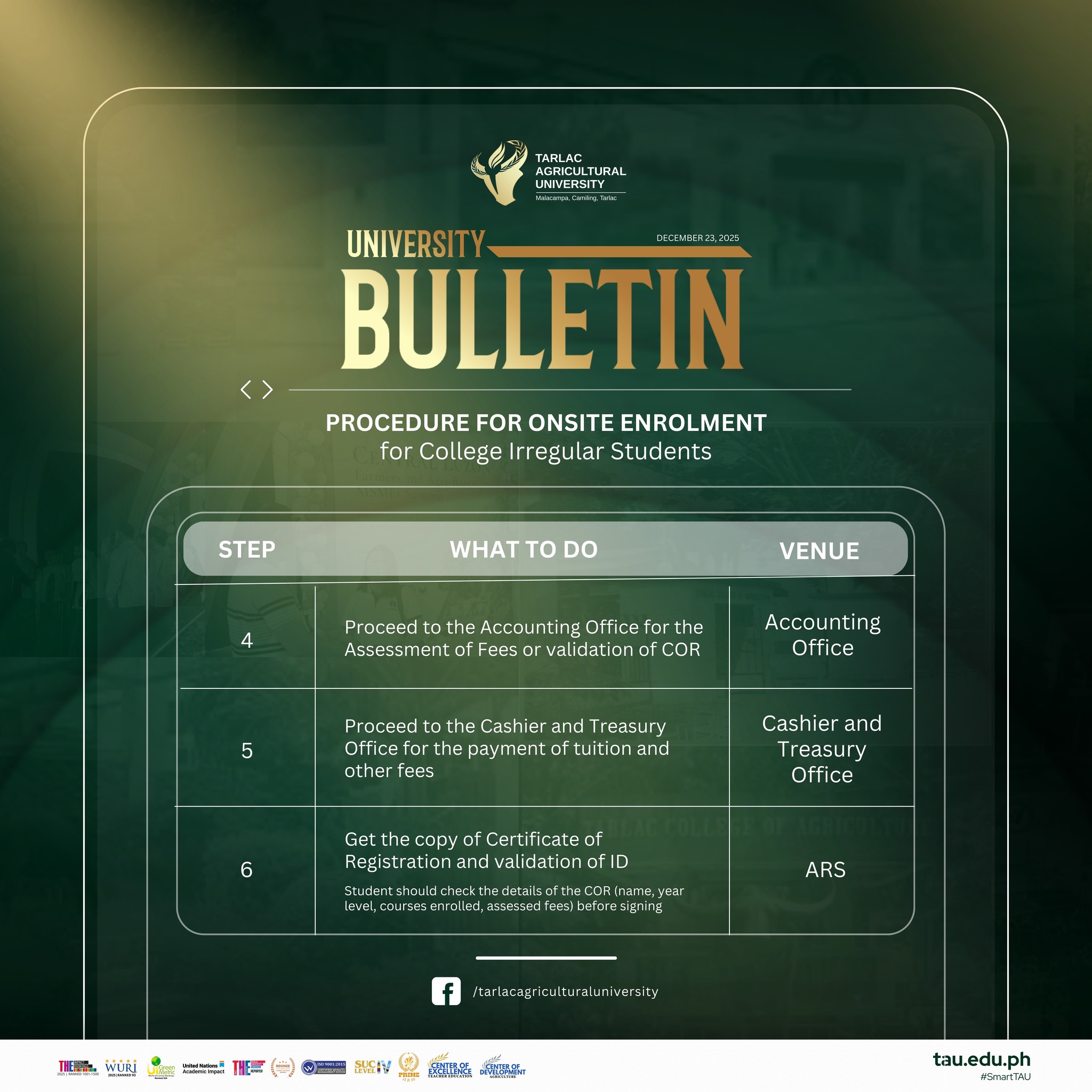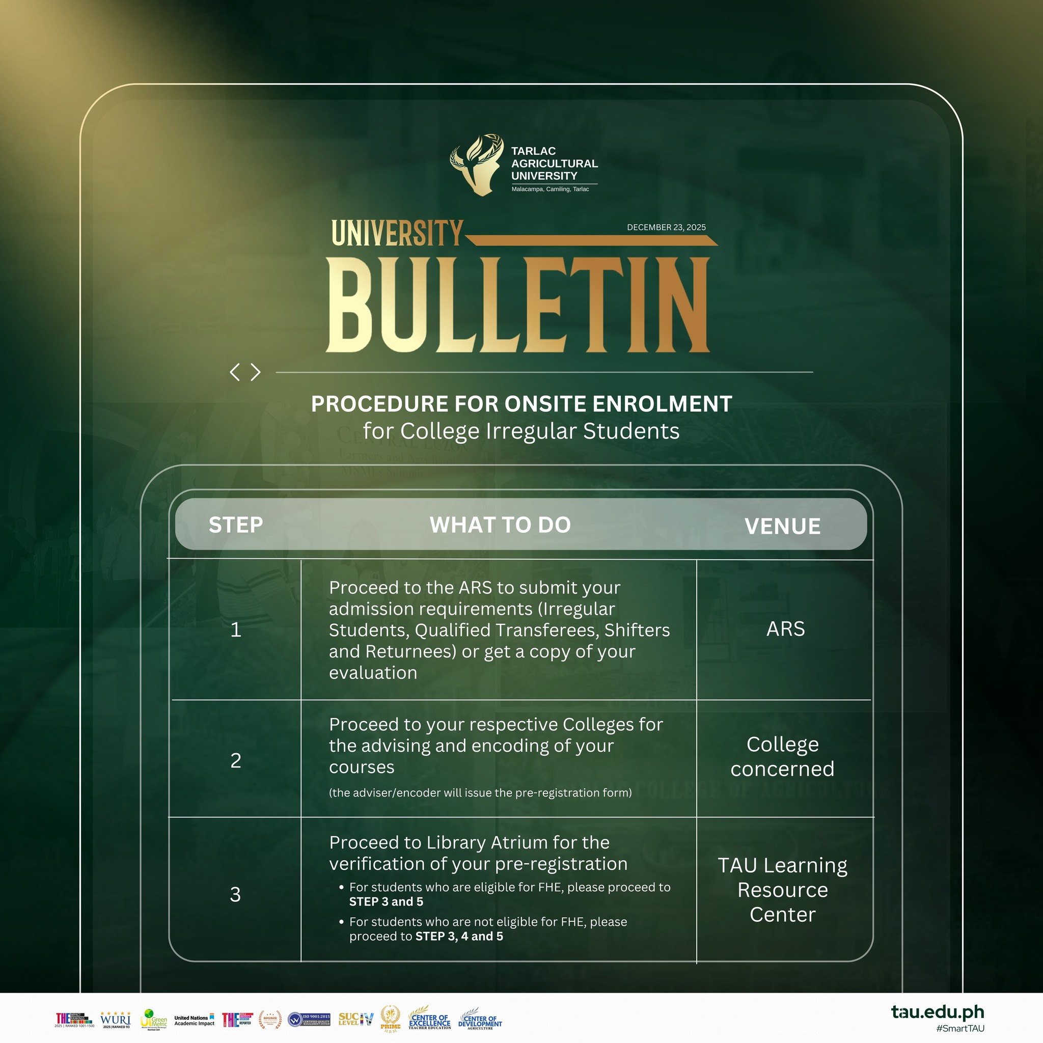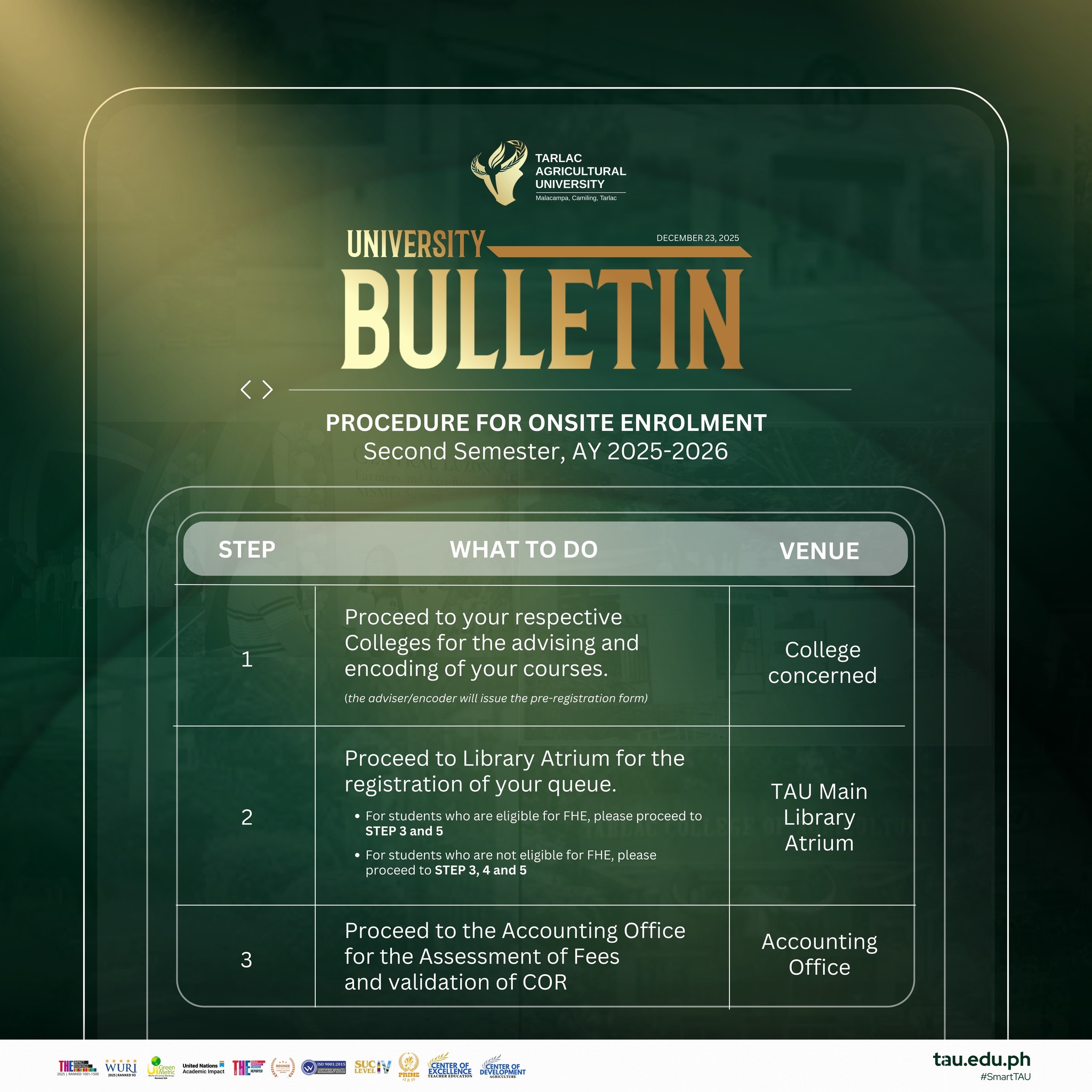 On-site enrollment officially begins on 5 January 2026. Make sure to check the posters for complete details, and prepare your requirements early to ensure a smooth, hassle-free experience. We look forward to welcoming everyone back to campus as classes start on 12 January for College Level and 17 January for Graduate Programs! Let this new term be another opportunity to learn, connect, and grow as one TAU community.