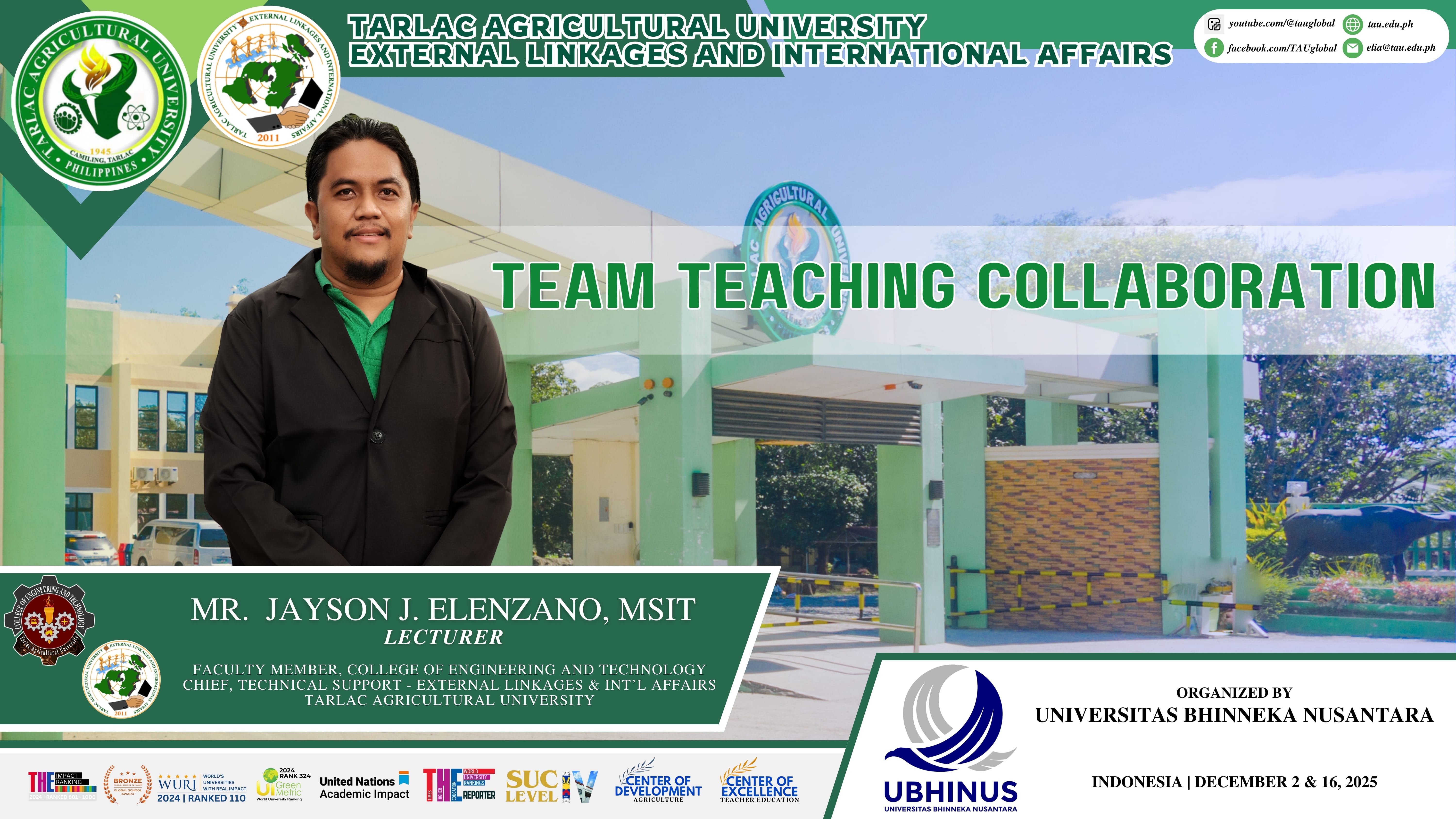 Mr. Jayson J. Elenzano, a faculty member from the Department of Computer Studies under the College of Engineering and Technology (CET) and Chief of Technical Support from External Linkages and International Affairs (ELIA) at Tarlac Agricultural University (TAU), shared valuable insights as a lecturer during the Team Teaching Collaboration between Tarlac Agricultural University (TAU) and Universitas Bhinneka Nusantara (UBHINUS) via Zoom on December 2, 2025.