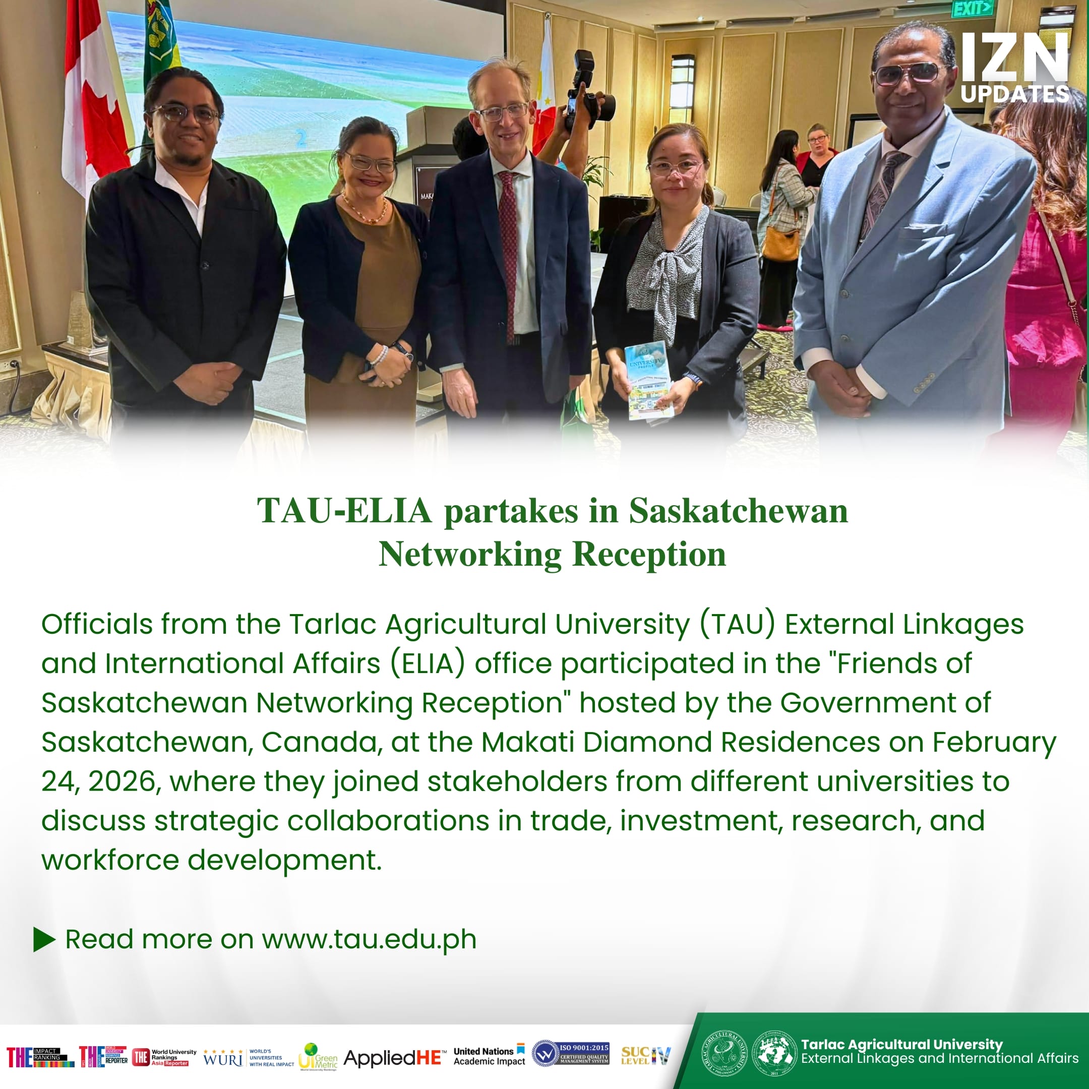 Officials from the Tarlac Agricultural University (TAU) External Linkages and International Affairs (ELIA) office participated in the "Friends of Saskatchewan Networking Reception" hosted by the Government of Saskatchewan, Canada, at the Makati Diamond Residences on 24 February 2026, where they joined stakeholders from different universities to discuss strategic collaborations in trade, investment, research, and workforce development.