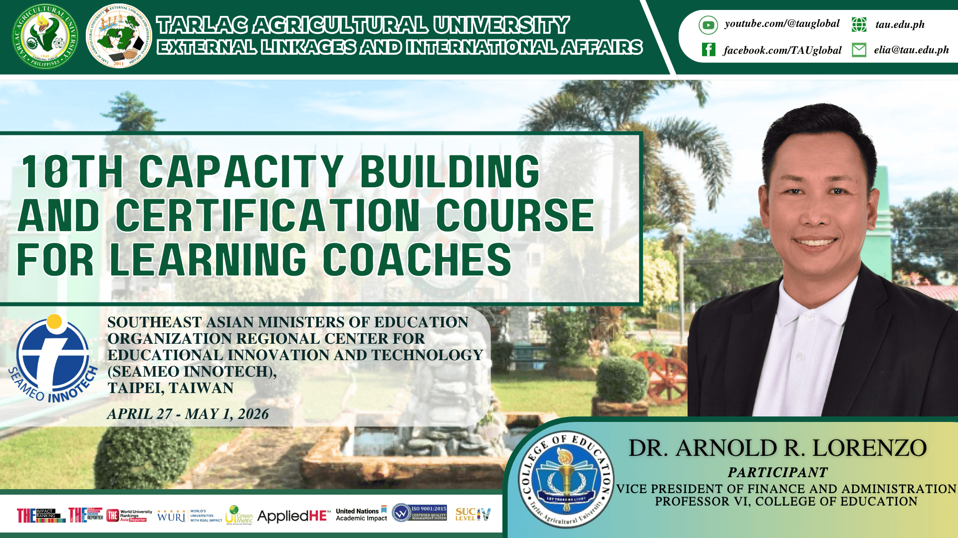 Reinforcing its pursuit of excellence in educational leadership, the Tarlac Agricultural University (TAU) has tapped Dr. Arnold R. Lorenzo, Vice President for Finance and Administration (VPFA) and Professor VI from the College of Education (CEd), to represent the University in the 10th Capacity Building and Certification Course for Learning Coaches organized by SEAMEO INNOTECH, set in Taipei, Taiwan, from 27 April to 1 May.ย