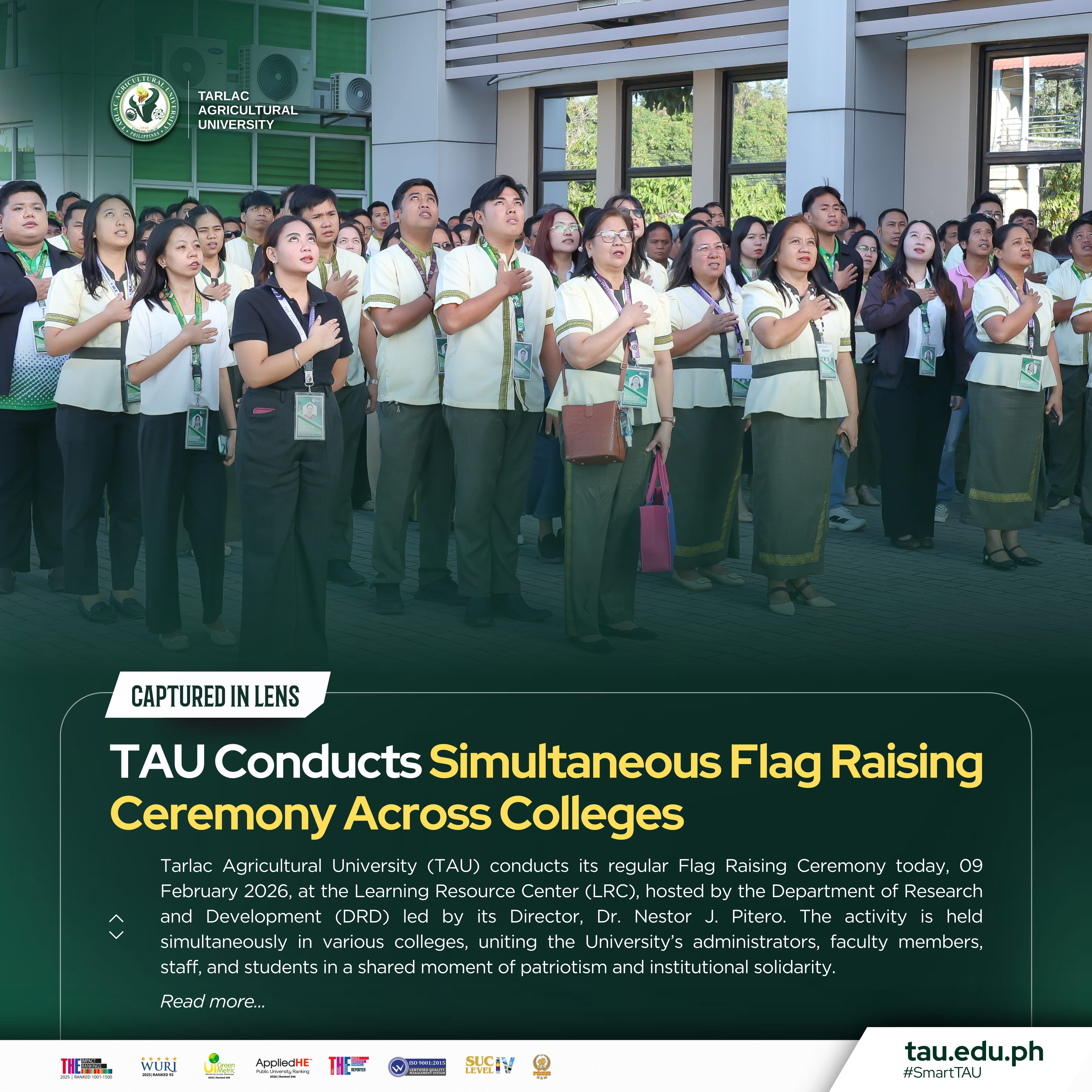 Tarlac Agricultural University (TAU) conducts its regular Flag Raising Ceremony today, 09 February 2026, at the Learning Resource Center (LRC), hosted by the Department of Research and Development (DRD) led by its Director, Dr. Noel J. Petero. The activity is held simultaneously in various colleges, uniting the Universityβs administrators, faculty members, staff, and students in a shared moment of patriotism and institutional solidarity.