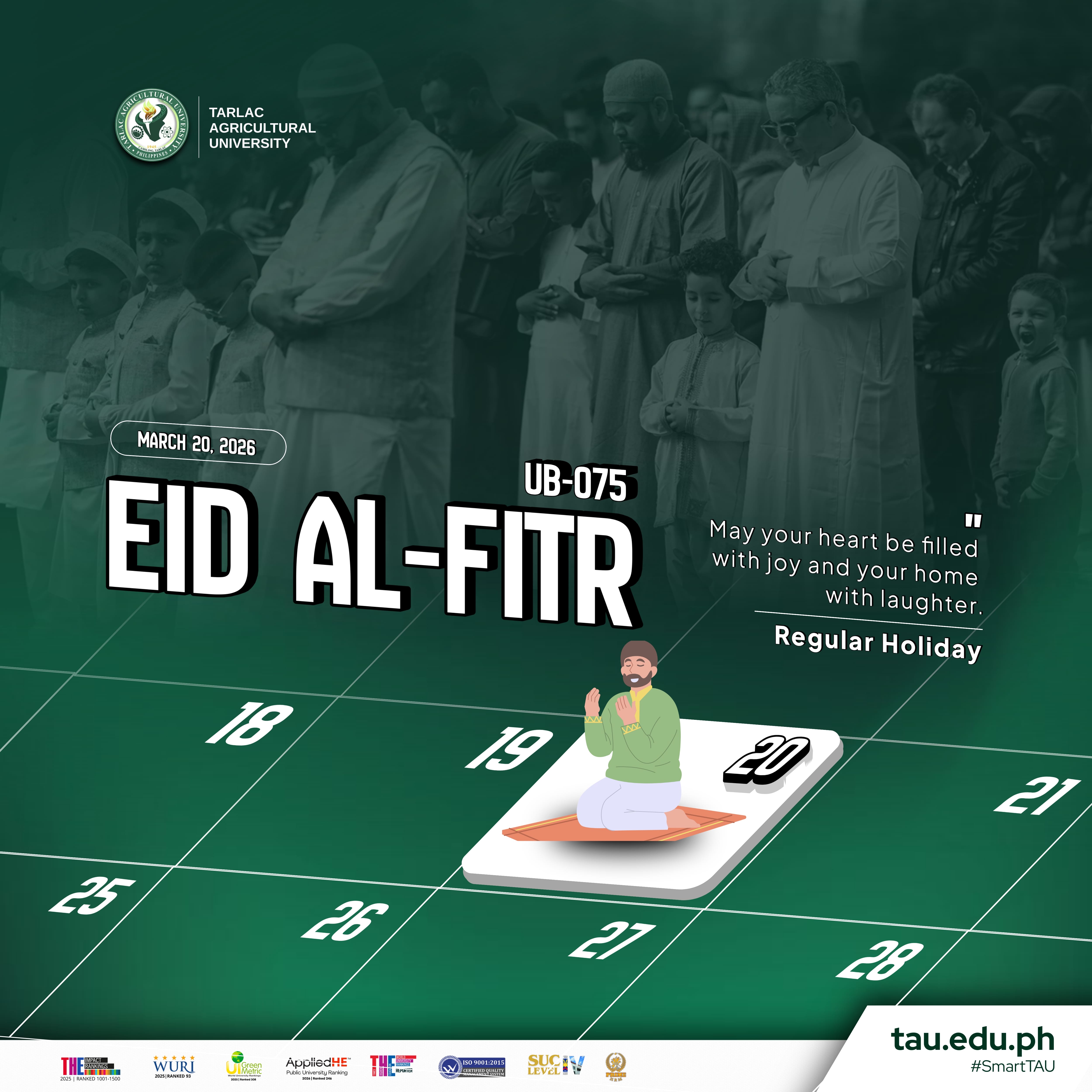 Tarlac Agricultural University (TAU) joins the nation in celebrating Eidβl Fitr (Feast of Ramadhan) as Friday, 20 March 2026, is declared a Regular Holiday throughout the country pursuant to Presidential Proclamation No. 1189, s. 2026. In solidarity with the Muslim community and in recognition of the cultural and spiritual significance of the occasion, regular classes and office transactions in the University are suspended, allowing the TAU community to take part in the national observance.