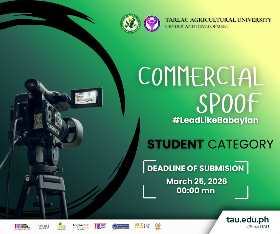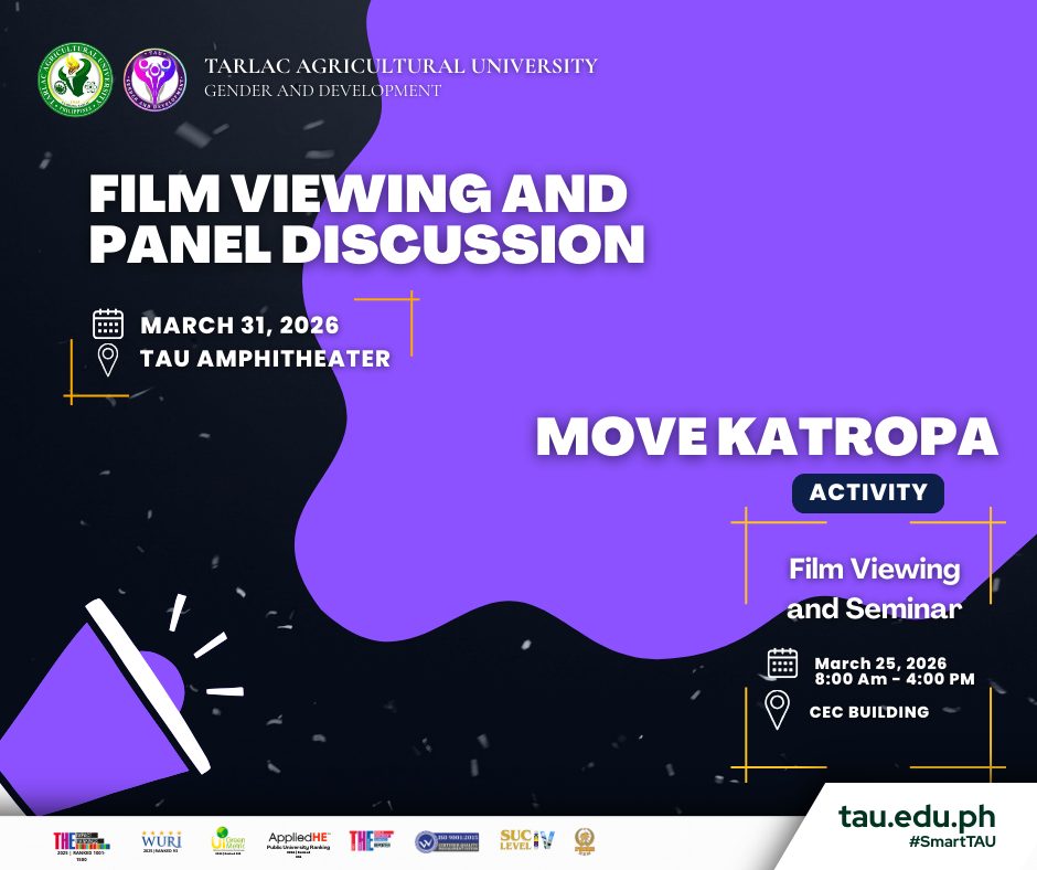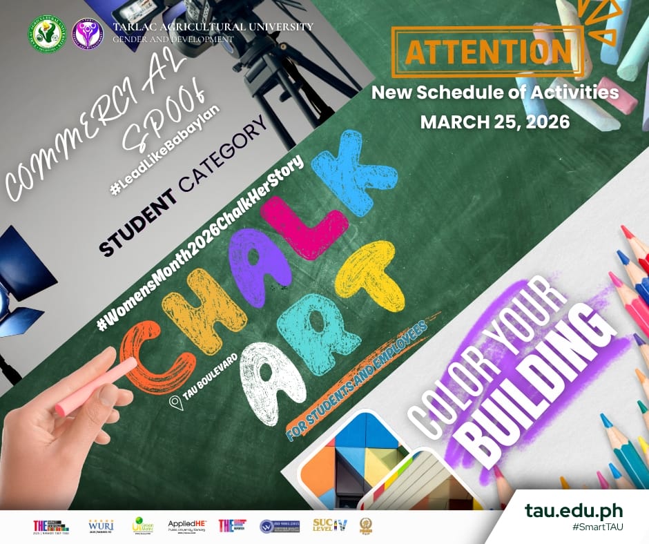 Tarlac Agricultural University (TAU) through the Gender and Development (GAD) Office announces the rescheduling of selected activities for the celebration of National Womenβs Month. Originally set on 31 March 2026, the activities will now be conducted on 25 March 2026 to ensure better participation and coordination within the University community.