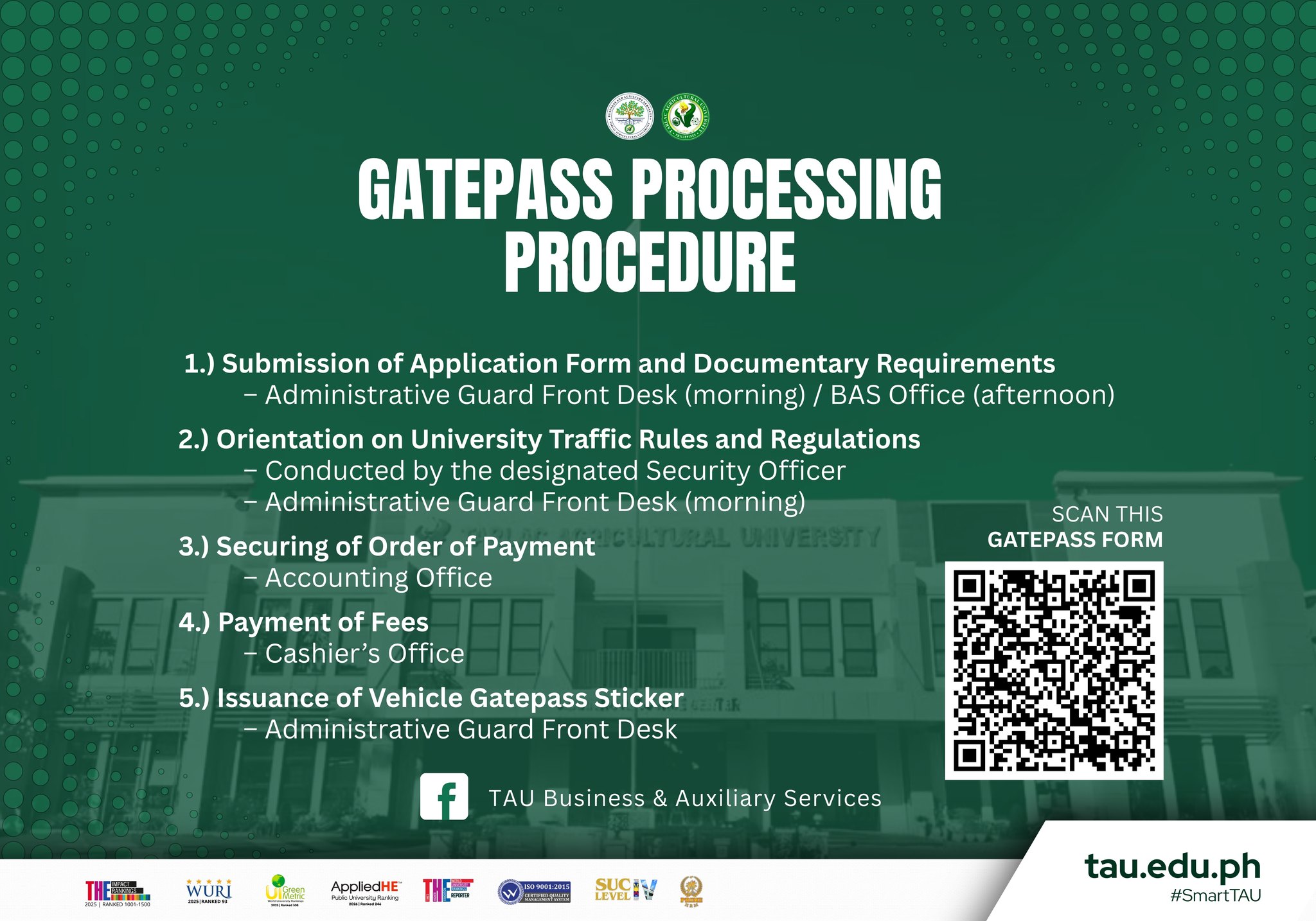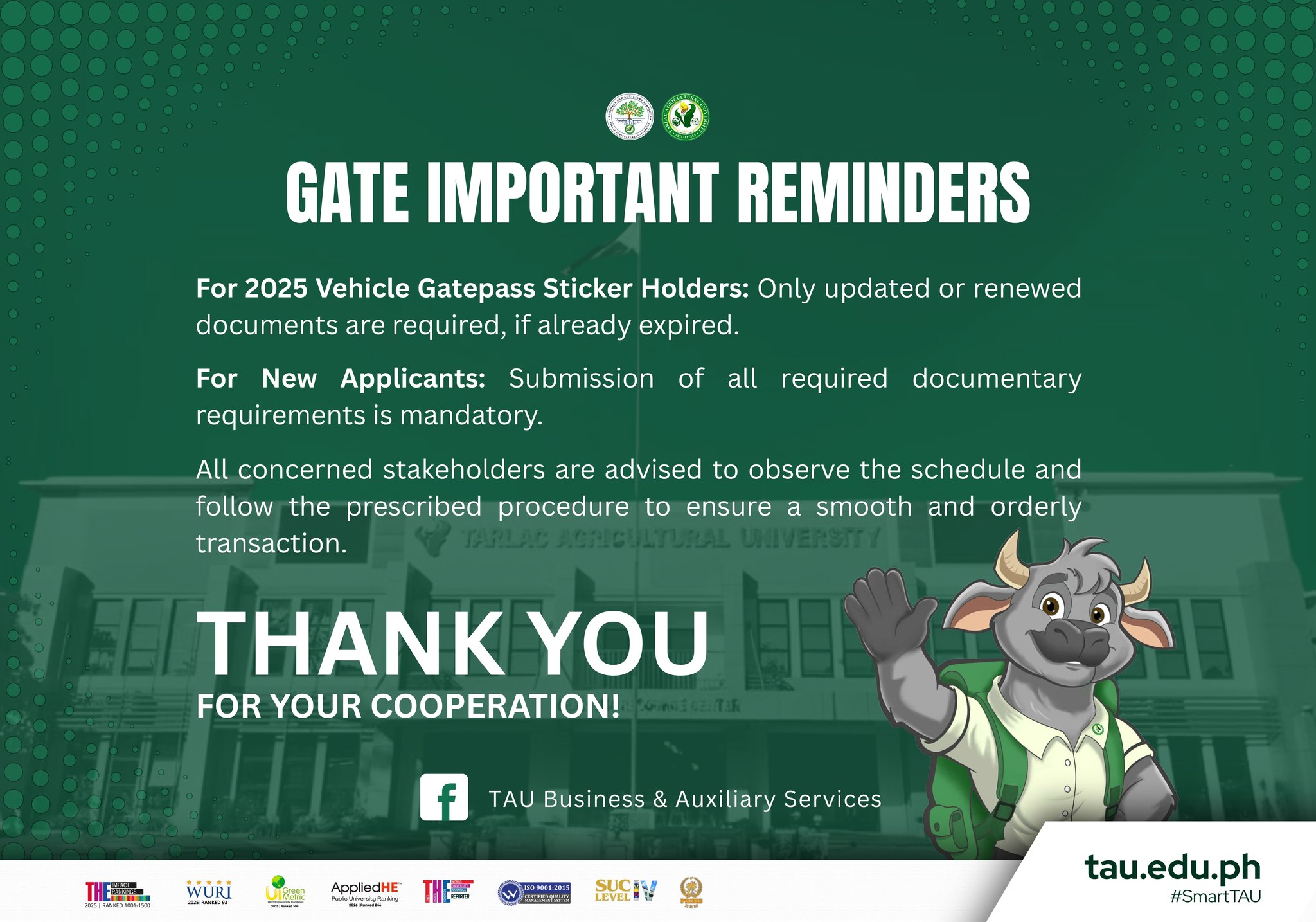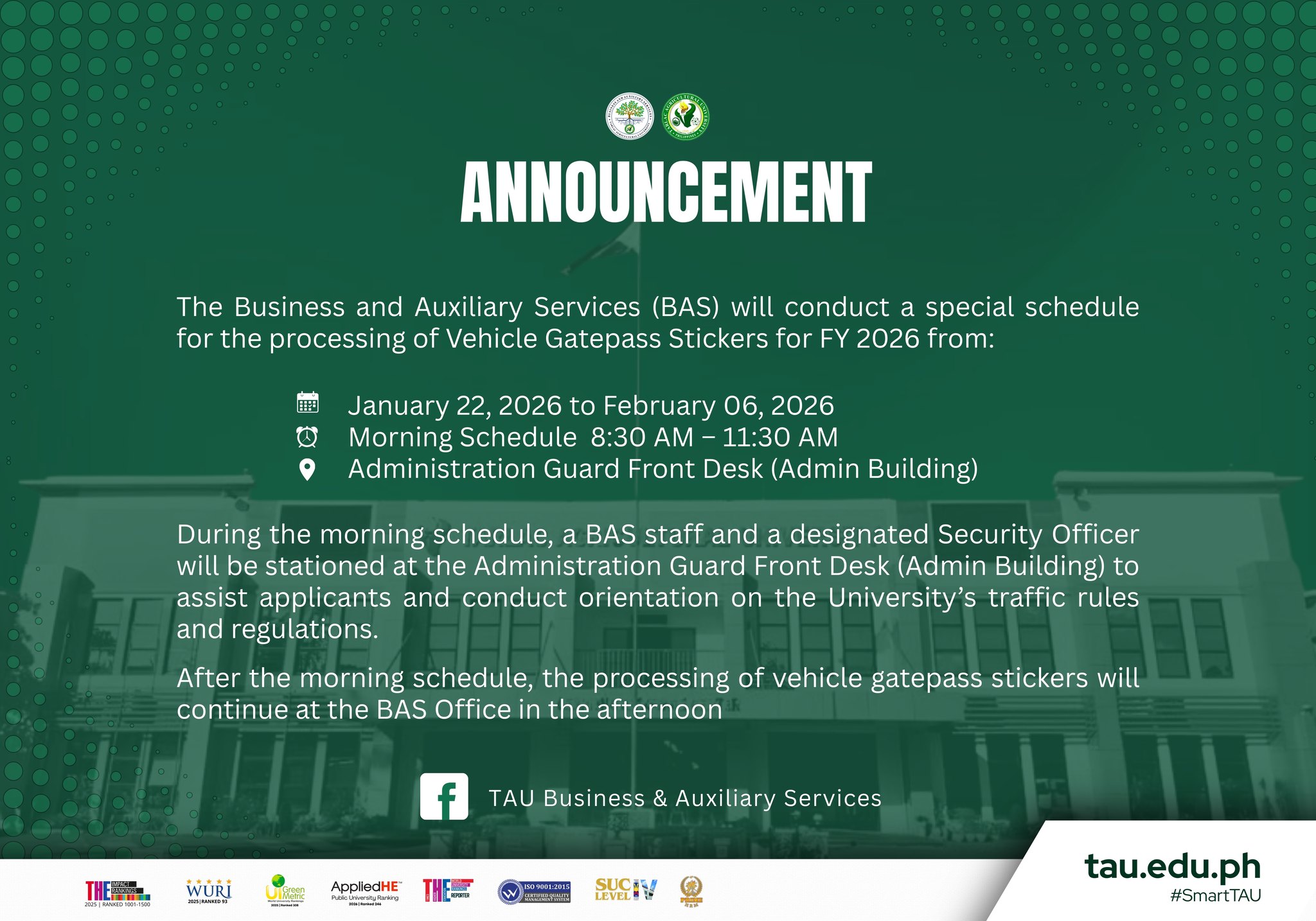 The Business and Auxiliary Services (BAS) announces the special processing period for the FY 2026 Vehicle Gatepass Stickers. This will run from 22 January to 6 February. A dedicated morning schedule from 8:30 AM to 11:30 AM will be held at the Administrative Guard Front Desk, where both a BAS staff member and a designated Security Officer will be available to assist applicants and conduct the required orientation on University traffic rules and regulations. Processing will continue at the BAS Office in the afternoon.