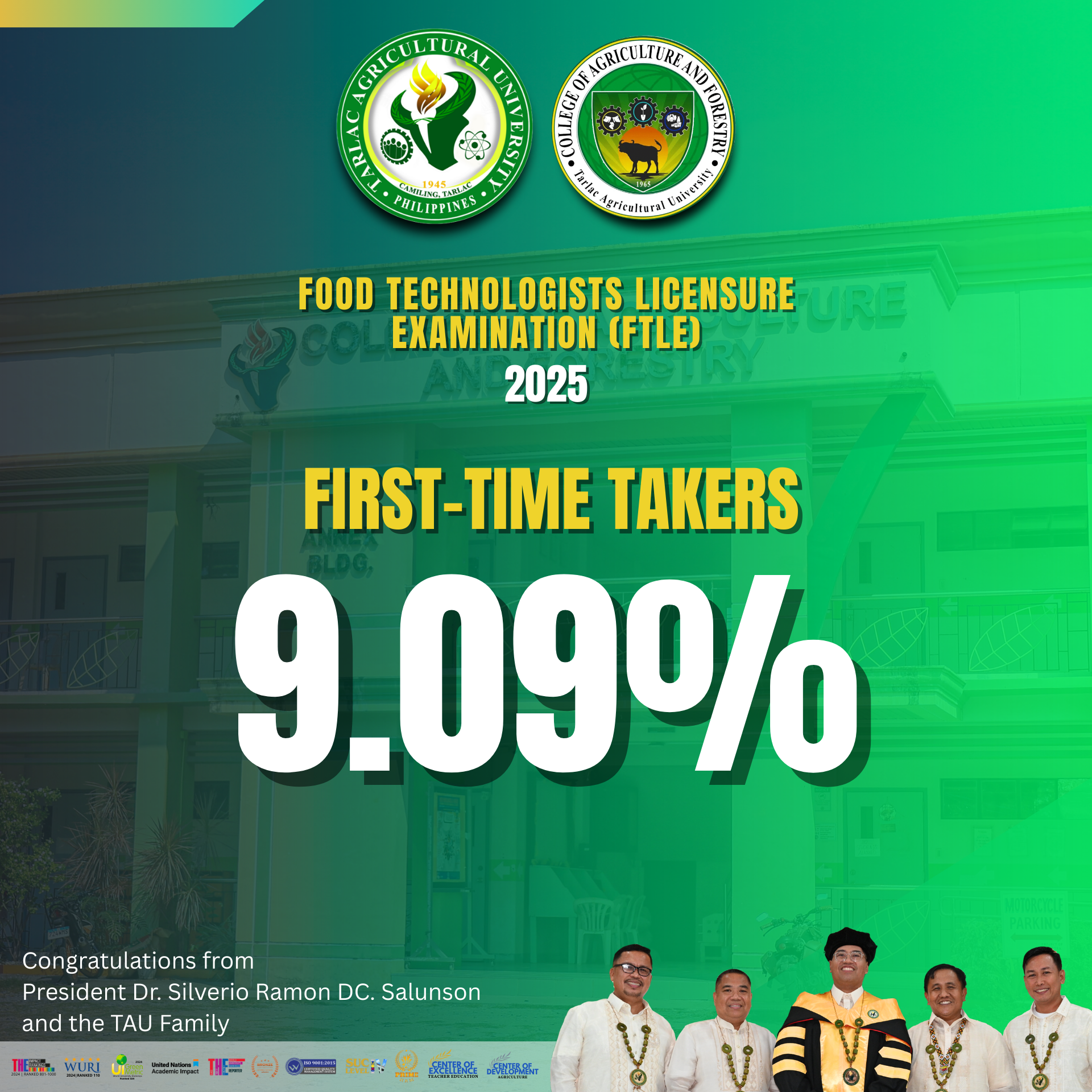 The Professional Regulation Commission (PRC) has released the results of the August 2025 Food Technologists Licensure Examination (FTLE), and the Tarlac Agricultural University (TAU), through the Philippine Association of Food Technologists (PAFT) Inc. - TAU Chapter, confirmed the achievement of producing another licensed food technologist with a rating of 81.25%.