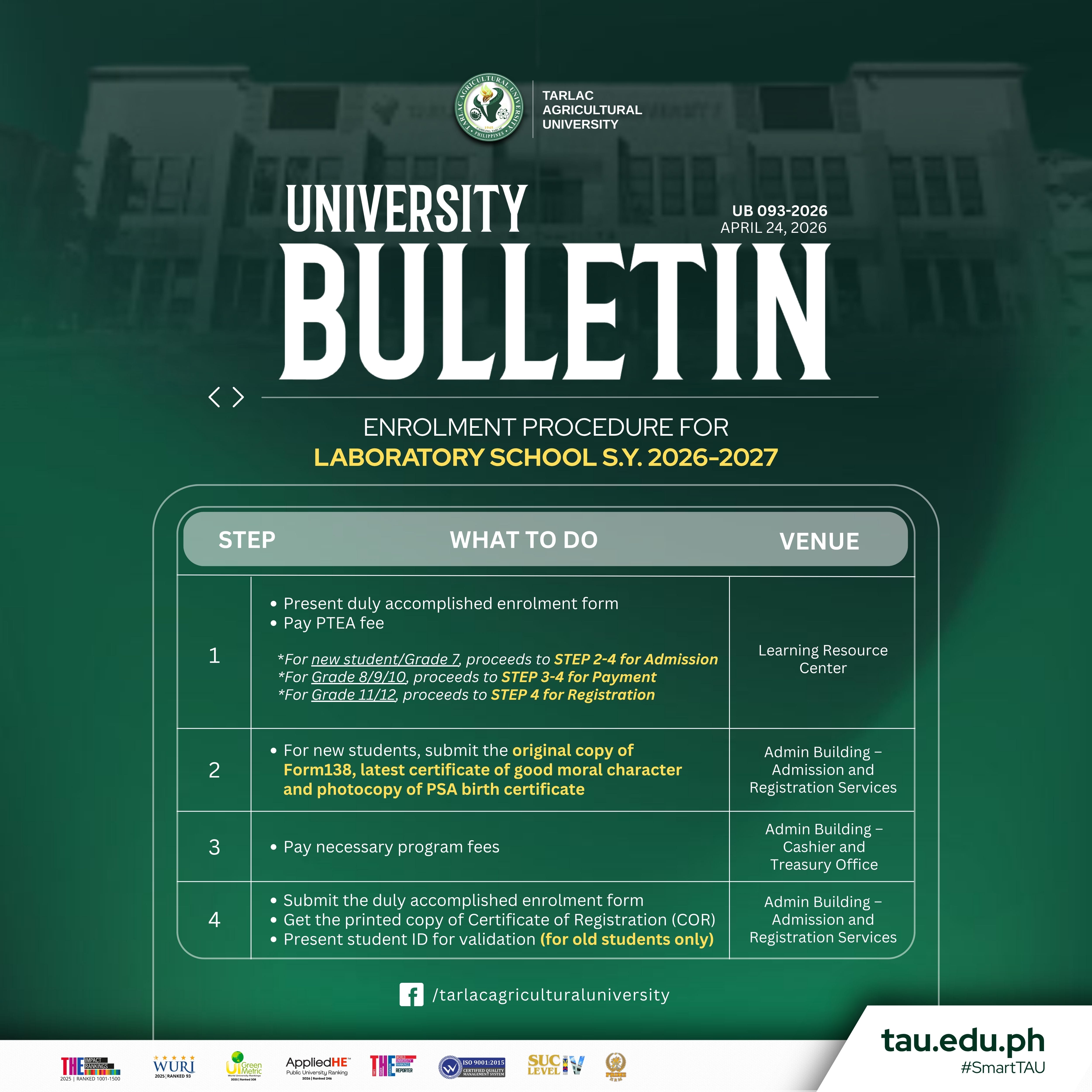 The Tarlac Agricultural University โ Laboratory School (TAU-LS) officially announces the enrollment schedule and procedures for School Year 2026โ2027. Enrollment will be conducted on the designated dates specified in the official advisory, with schedules arranged per grade level to ensure an orderly and efficient process. All incoming and continuing learners, together with their parents and guardians, are advised to strictly follow the assigned enrollment dates, complete the required forms, and submit all necessary documents within the prescribed period.