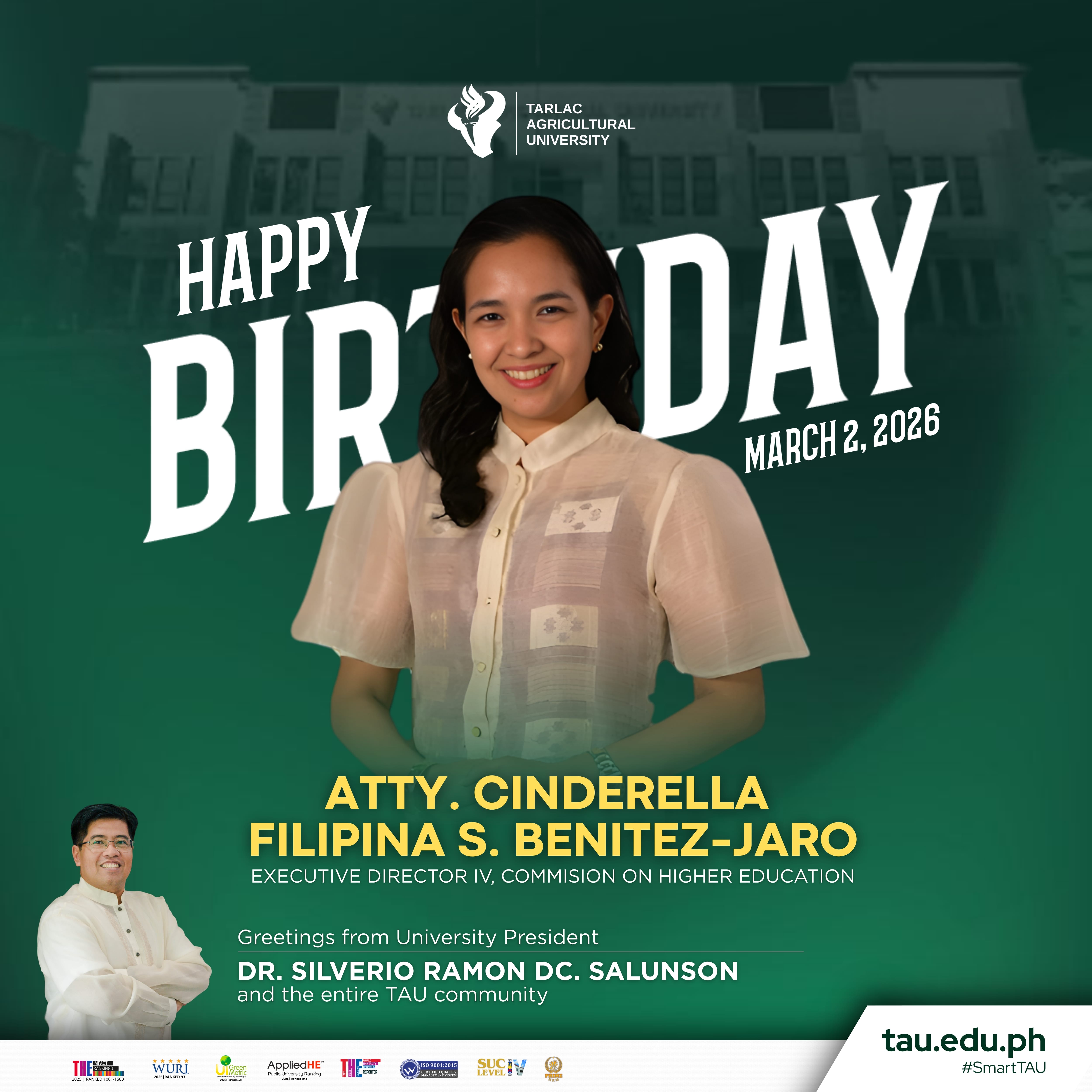 The Tarlac Agricultural University (TAU) community extends its warmest and most heartfelt birthday greetings to Atty. Cinderella Filipina S. Benitez-Jaro, Executive Director IV of the Commission on Higher Education (CHEd). On this special day, we join your loved ones and colleagues in celebrating not only another year of your life but also the remarkable contributions you have made to the advancement of higher education in our country.