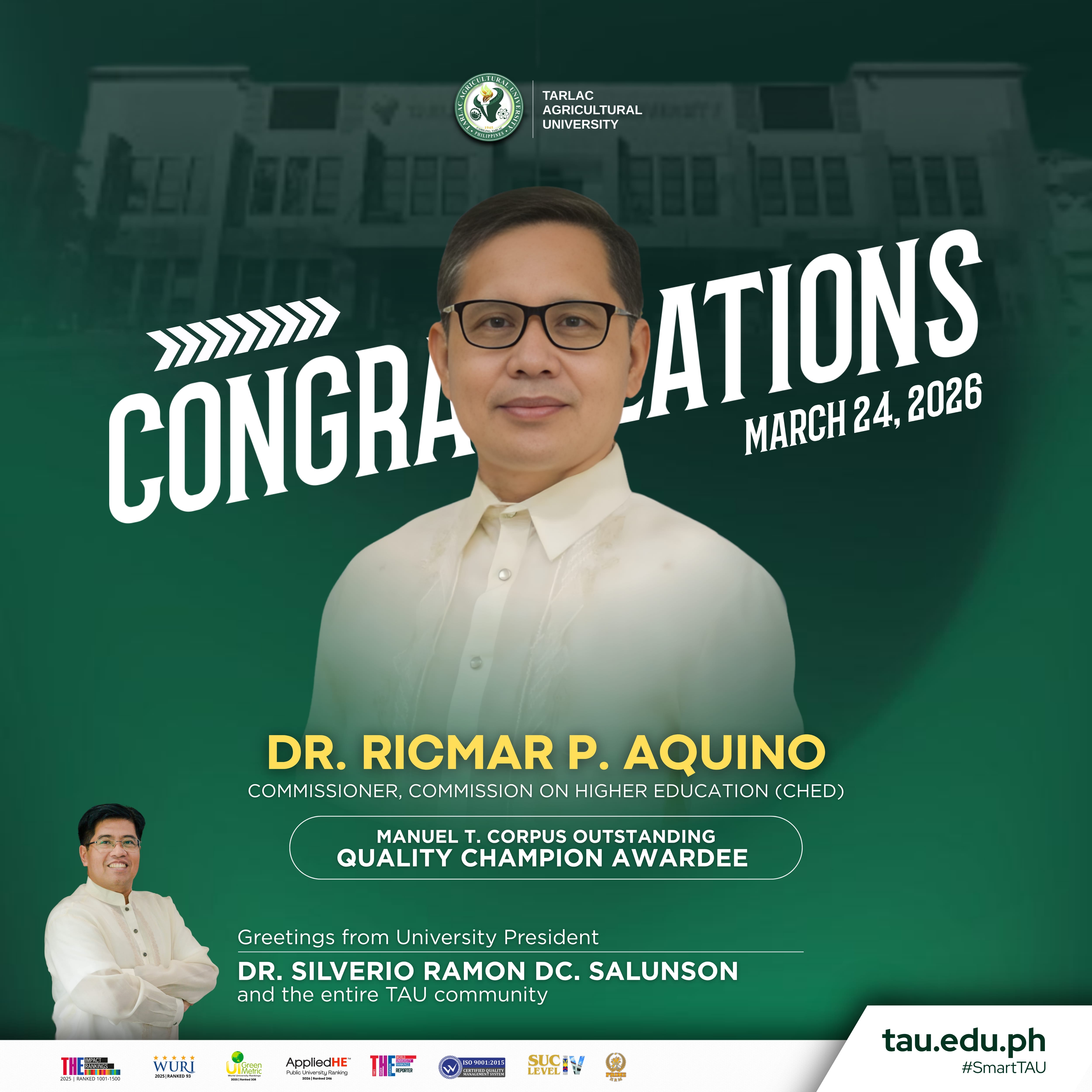 The Tarlac Agricultural University (TAU) community, under the leadership of the University President Dr. Silverio Ramon DC. Salunson, proudly extends its warmest congratulations to Honorable Ricmar P. Aquino, Commissioner of the Commission on Higher Education (CHED), for being named as one of the distinguished recipients of the Manuel T. Corpus Outstanding Quality Champion Award conferred by the Accrediting Agency of Chartered Colleges and Universities in the Philippines (AACCUP). This prestigious recognition, regarded as the highest honor for performance excellence, is bestowed upon leaders who demonstrate exemplary commitment to advancing quality assurance in public higher education.