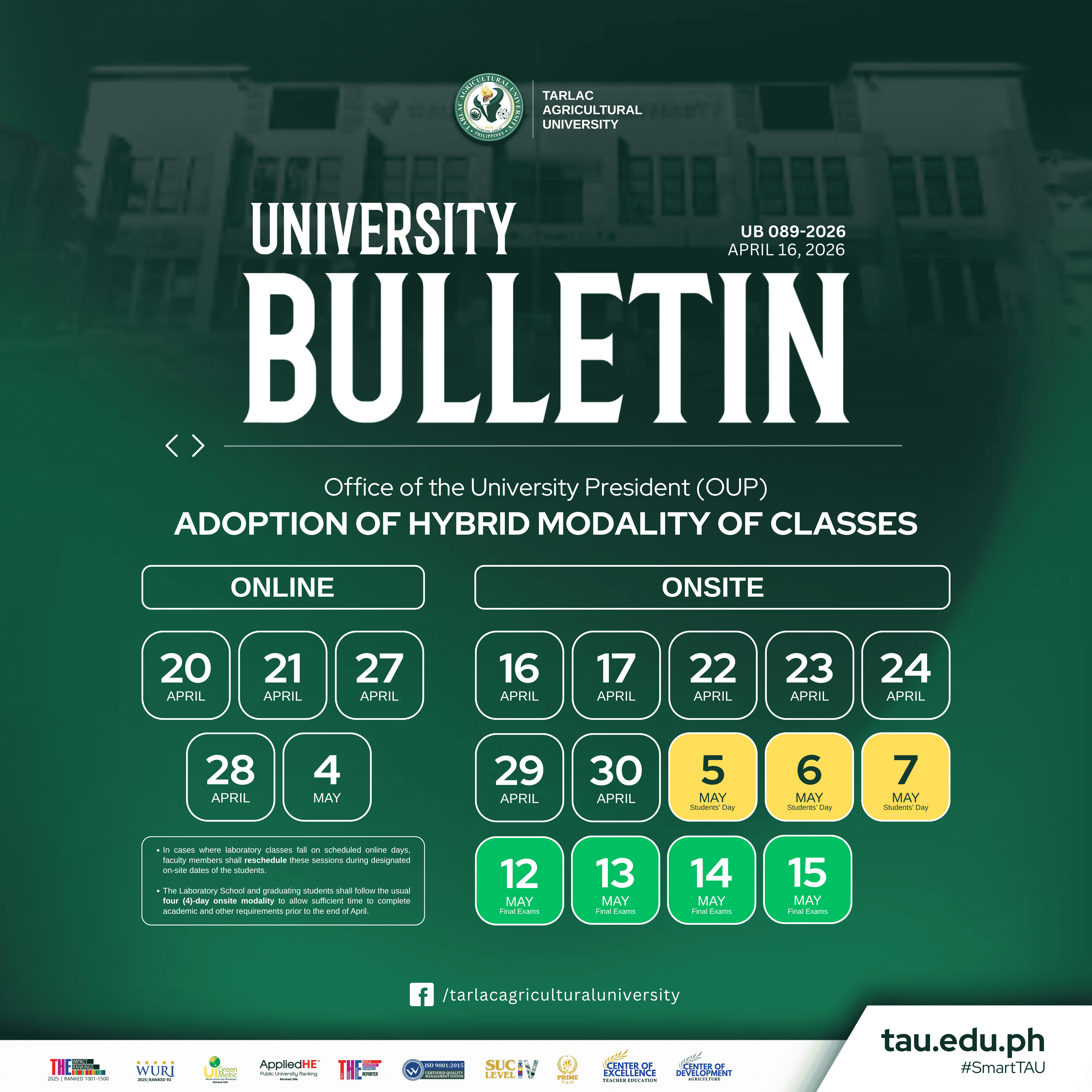 The Tarlac Agricultural University (TAU), through the Office of the University President (OUP), informs all students that, effective for the remainder of the semester, a hybrid class modality will be implemented in accordance with EO 110, s. 2026; Memorandum Circular No. 114, s. 2026; and CMO No. 117, s. 2026, following consultations with concerned stakeholders.