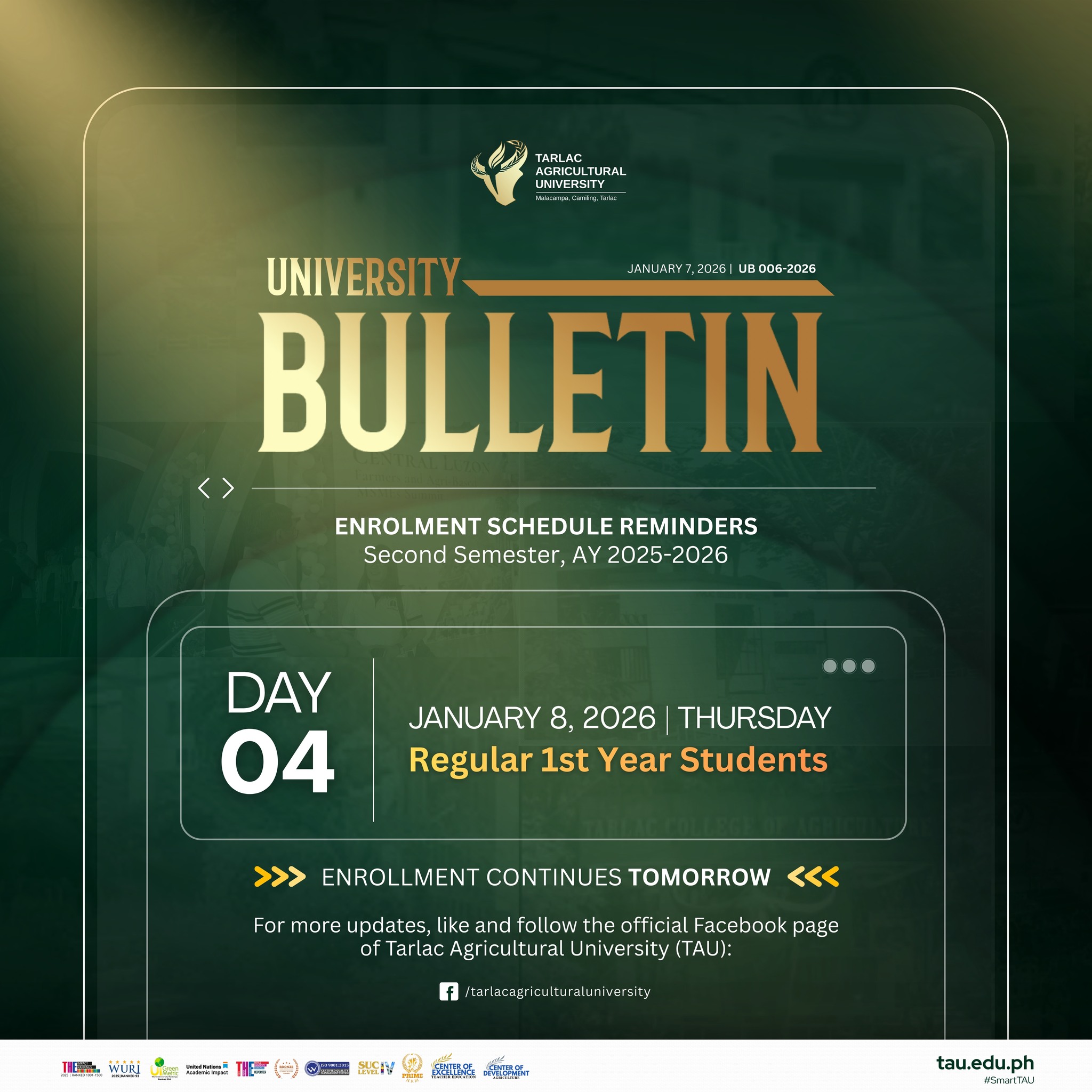 In preparation for the 3rd Midyear Commencement Exercises tomorrow, January 9, the University Disaster Risk Reduction and Management Office (UDRRMO) issues this advisory to ensure safety, order, and smooth campus operations. Parking in front of the Gilberto O. Teodoro Multipurpose Center is strictly reserved for VIPs and official university shuttle services only. AdCo members, faculty, and staff attending the Baccalaureate Service are advised to park behind the CBM Building, while graduands are requested to park their vehicles at the opposite side of the campus.