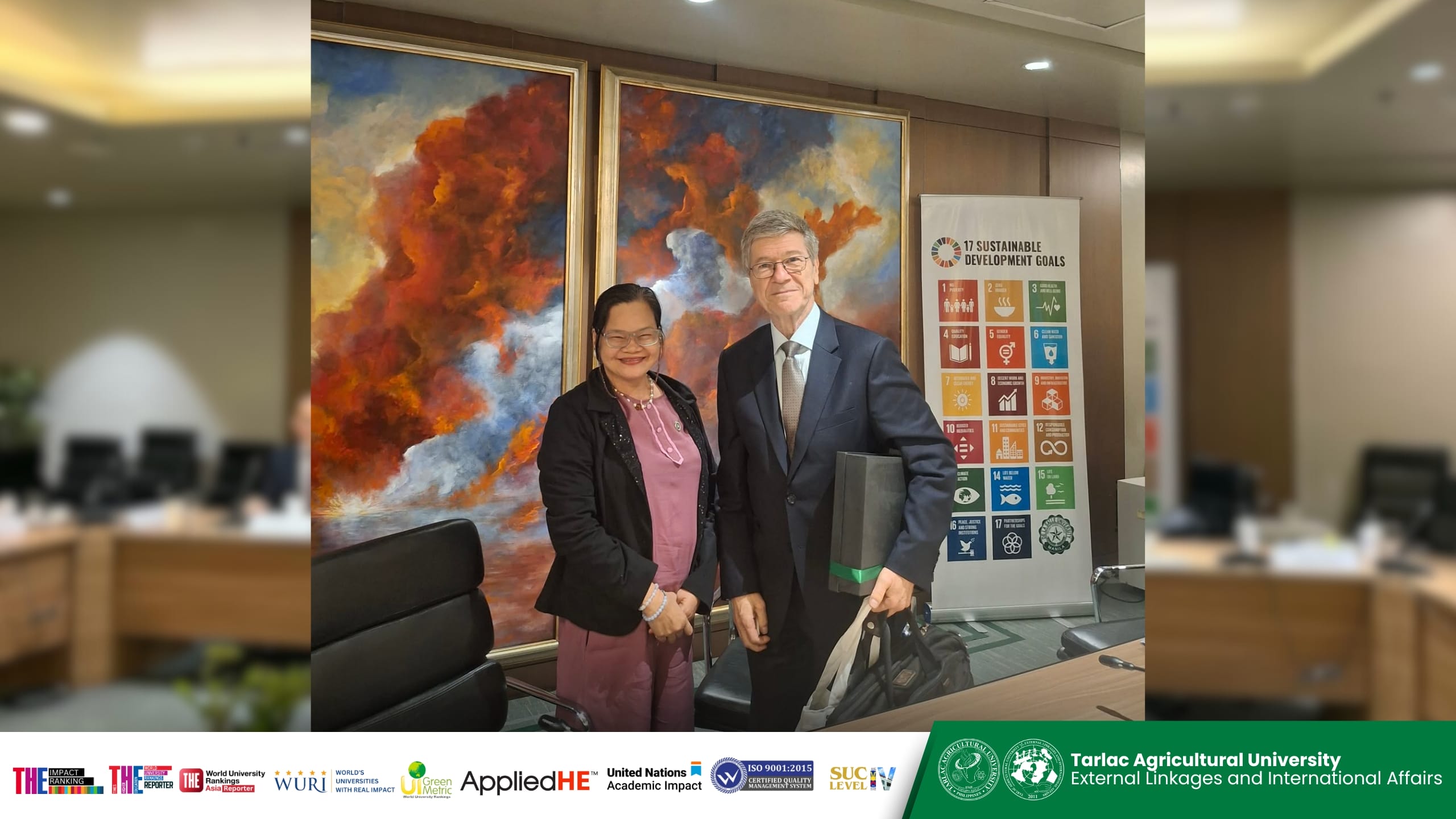Dr. Marianne P. Villaruel, Director of External Linkages and International Affairs (ELIA) of Tarlac Agricultural University (TAU) engaged in a purposeful meeting with Professor Jeffrey Sachs, President of the Sustainable Development Solutions Network (SDSN) at De La Salle University (DLSU), Manila on January 21, 2026.