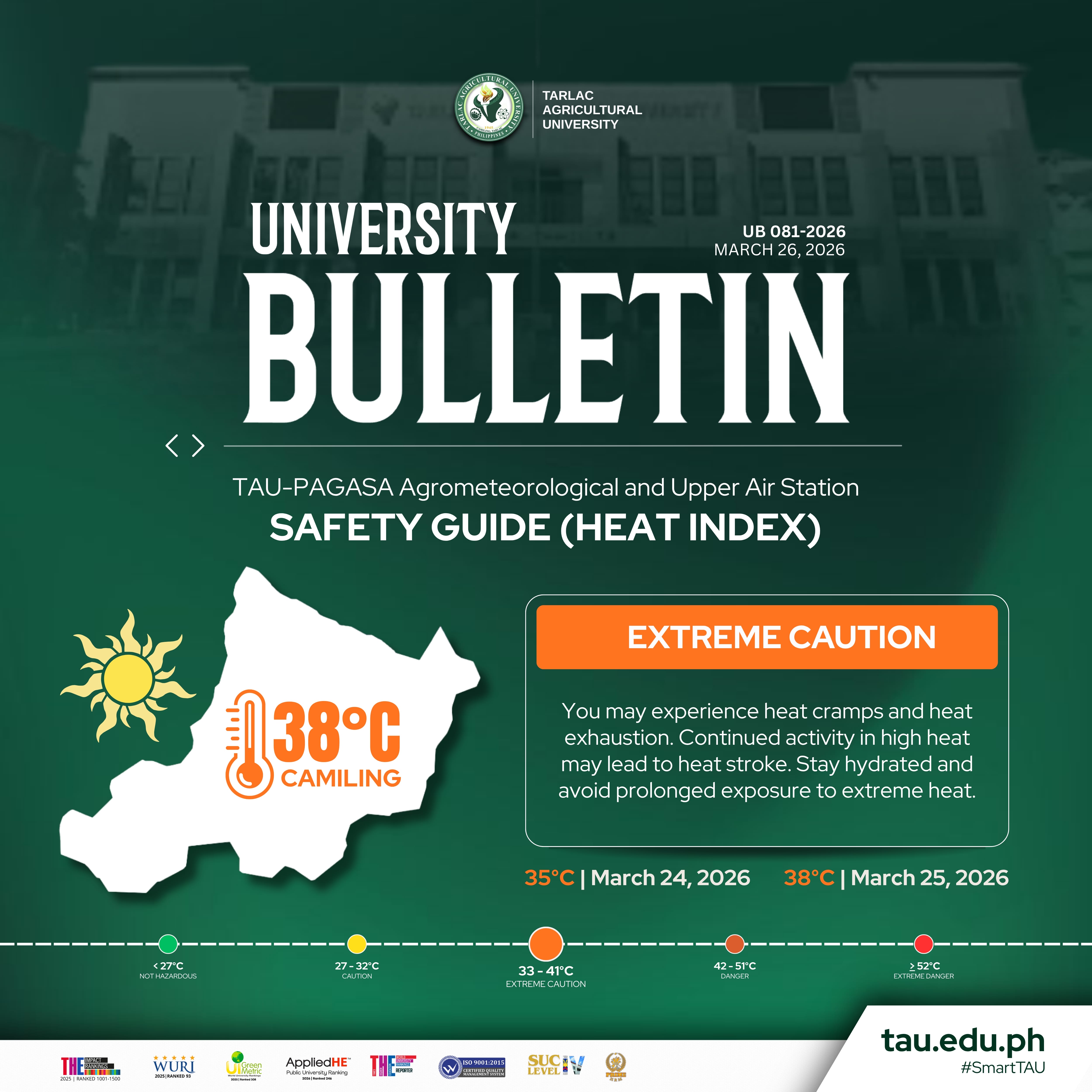 Under this classification, TAUians are advised to prioritize their well-being by watching for signs of heat-related stress. Staying active in high temperatures can be taxing on the body, so remember to pace yourself and find shade. We encourage everyone to take simple precautions during peak hours and stay connected via the Stationโs Facebook page: https://bit.ly/TAUAgromet.