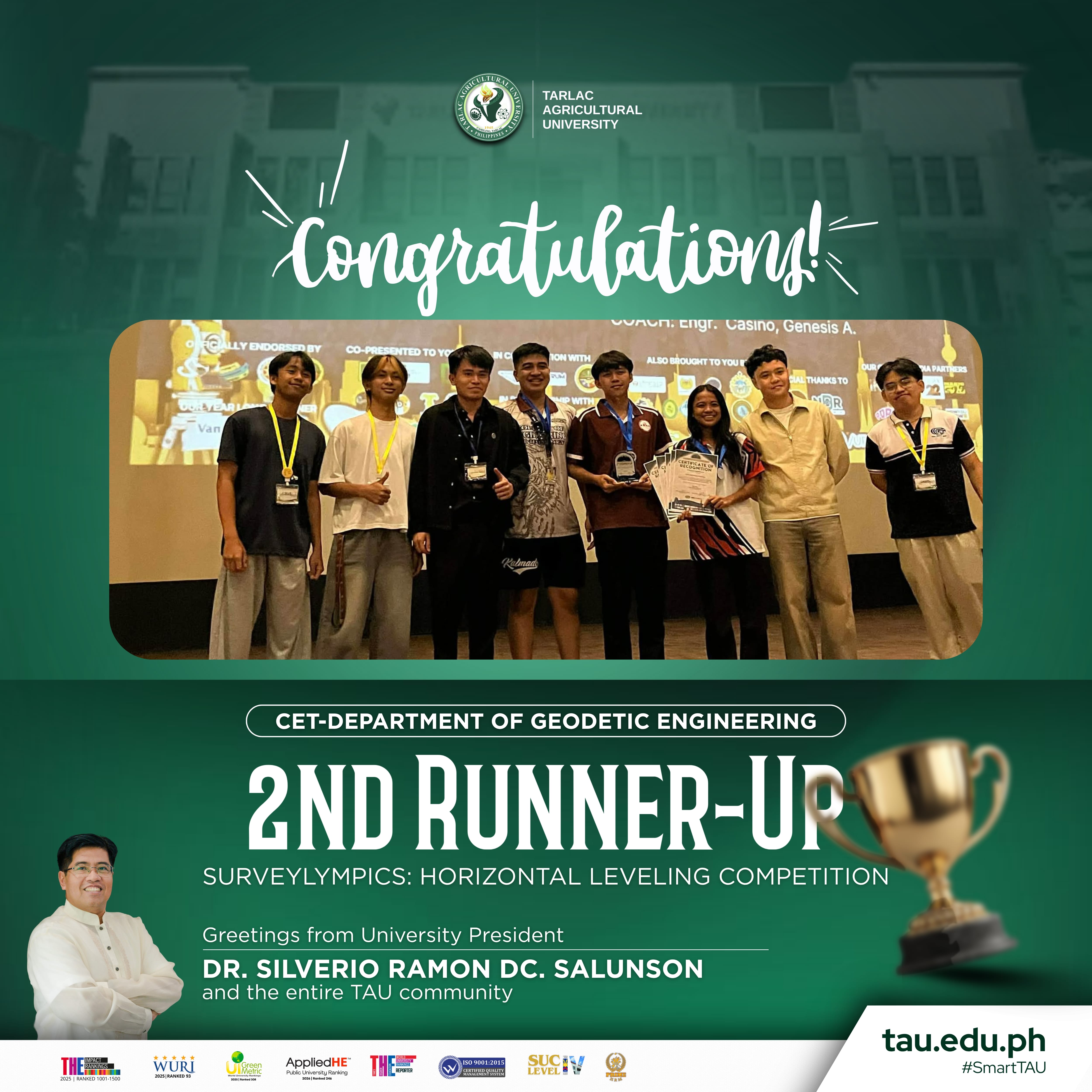 Congratulations to the team from the Tarlac Agricultural University (TAU) - College of Engineering and Technology (CET) for securing 2nd Runner-Up in the Surveylympics: Horizontal Leveling Competition.