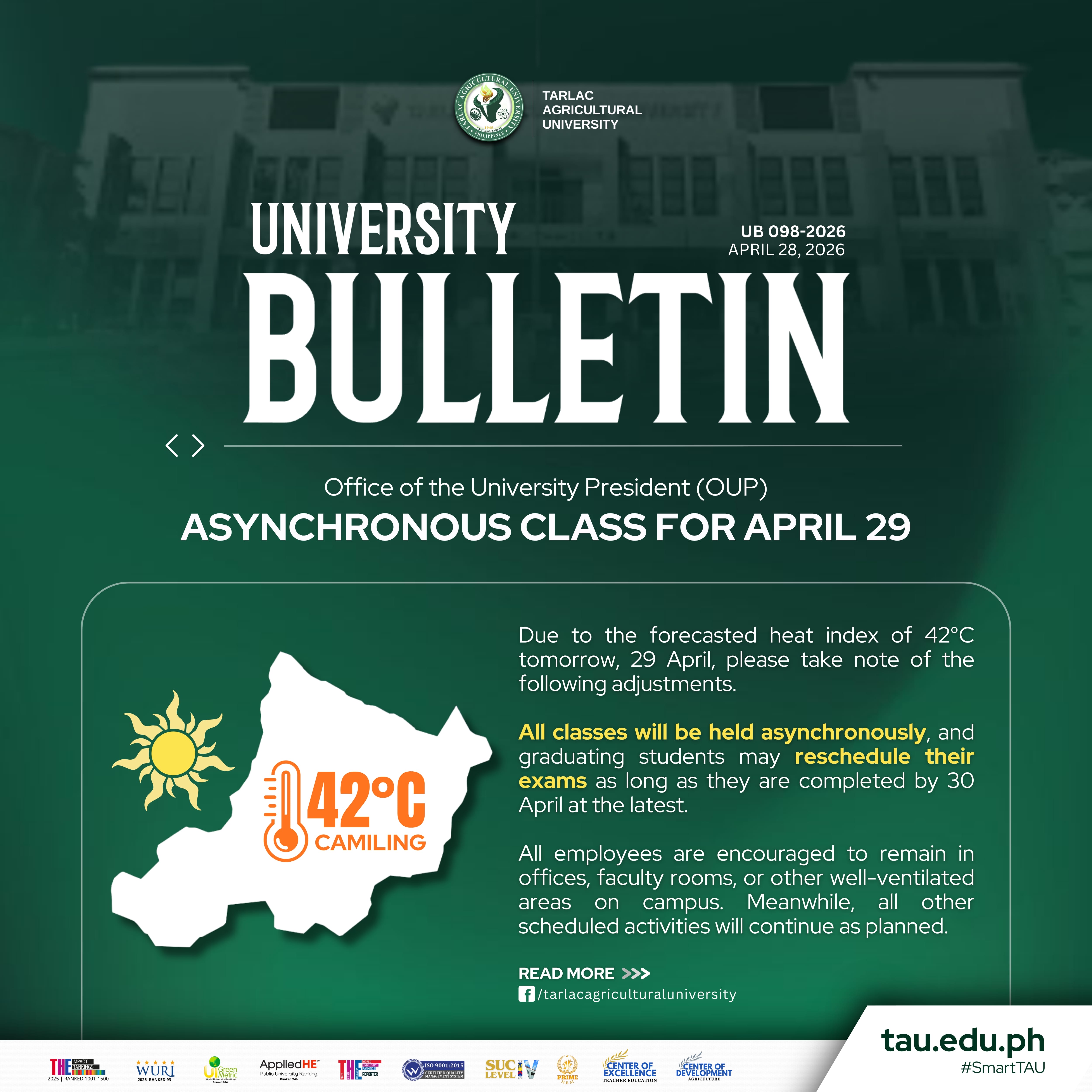 Due to the forecasted heat index of 42ยฐC tomorrow, 29 April, please take note of the following adjustments.ย