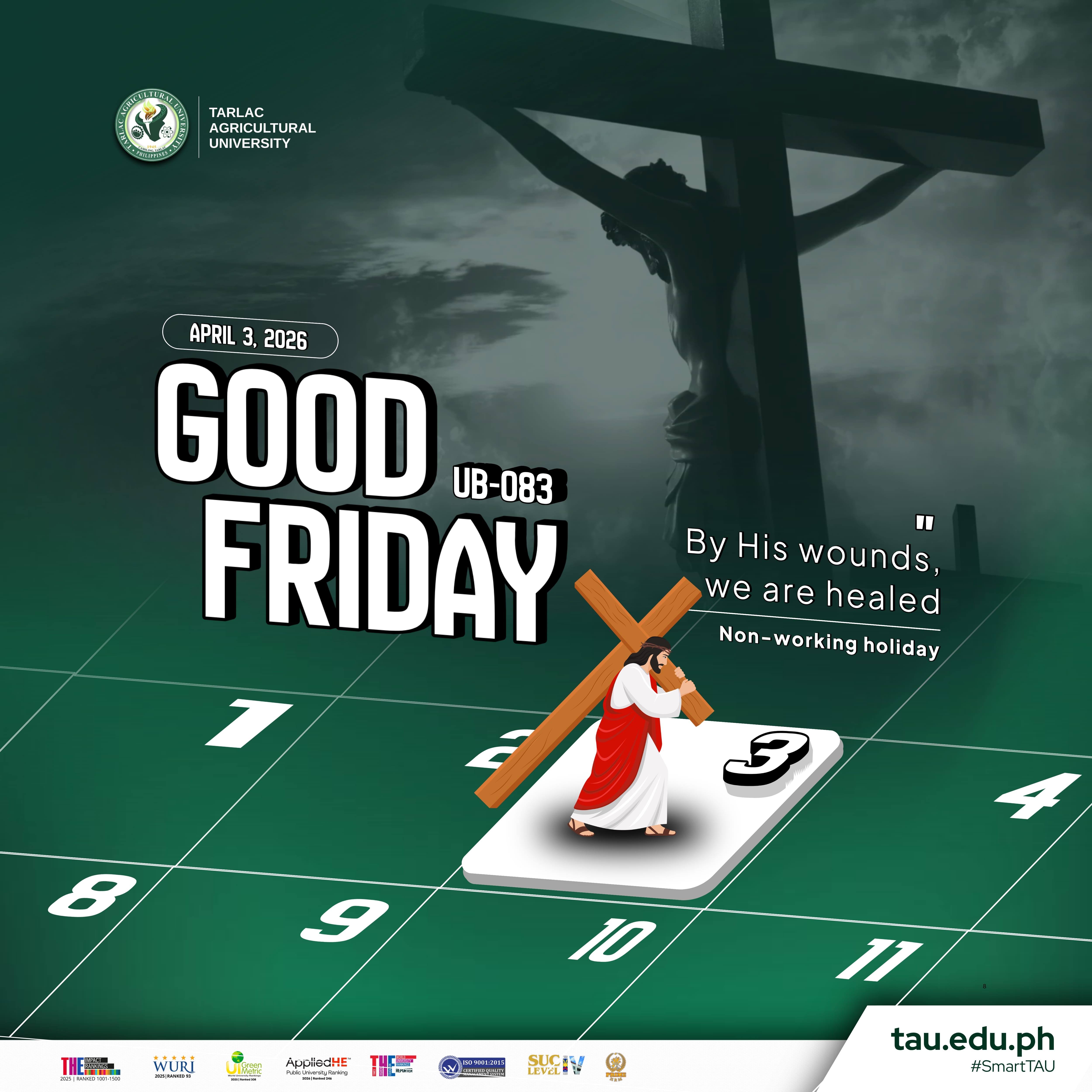In solemn observance of Good Friday on 3 April 2026, the Tarlac Agricultural University (TAU) joins the Christian community in commemorating the passion, suffering, and sacrifice of Jesus Christ. As part of the Holy Week tradition, the University encourages all stakeholders; students, faculty, and staff to pause from their daily routines and engage in meaningful reflection, prayer, and spiritual renewal. This sacred day invites everyone to contemplate the values of humility, compassion, and selfless love that are at the heart of the Christian faith.