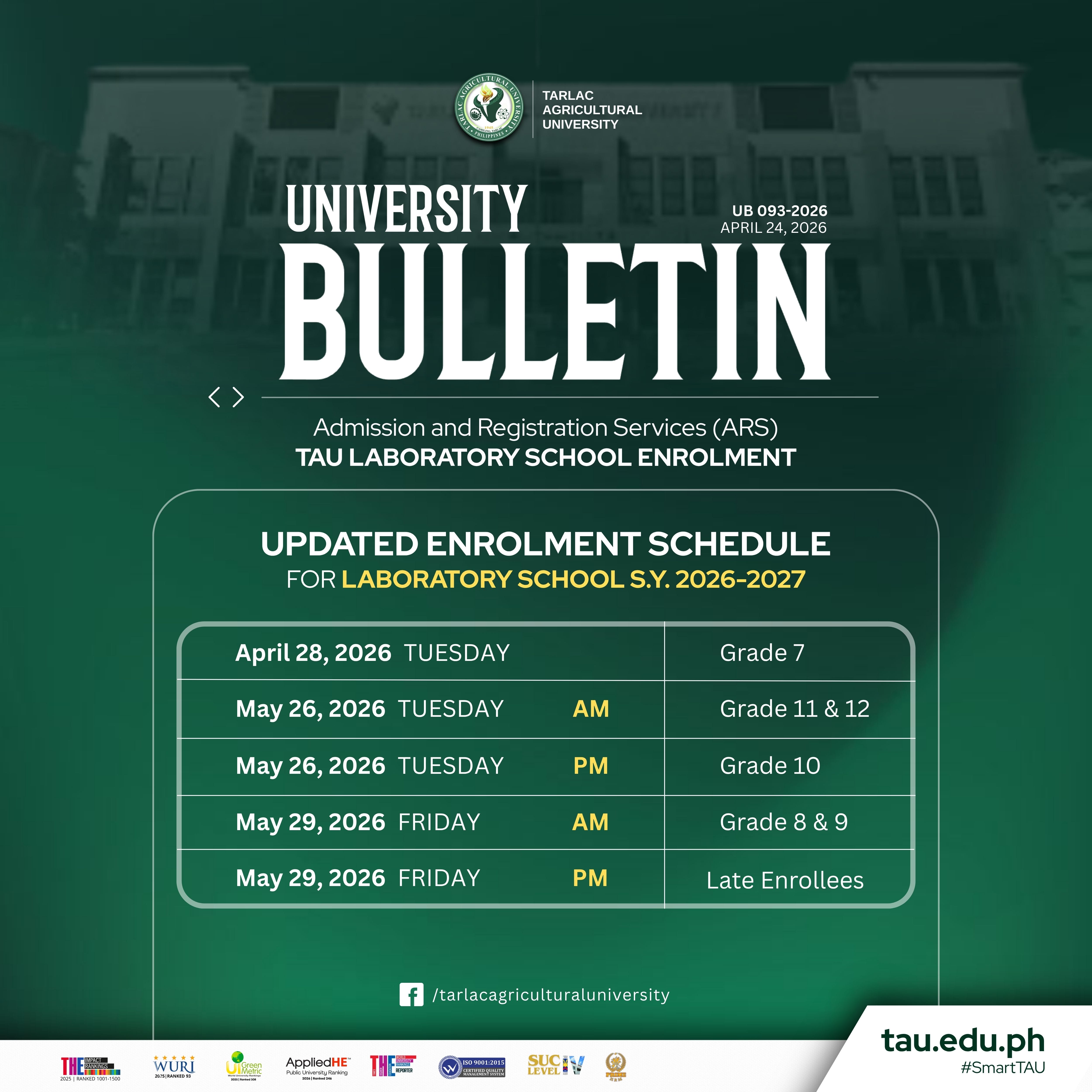 The Tarlac Agricultural University โ Laboratory School (TAU-LS) officially announces the enrollment schedule and procedures for School Year 2026โ2027. Enrollment will be conducted on the designated dates specified in the official advisory, with schedules arranged per grade level to ensure an orderly and efficient process. All incoming and continuing learners, together with their parents and guardians, are advised to strictly follow the assigned enrollment dates, complete the required forms, and submit all necessary documents within the prescribed period.