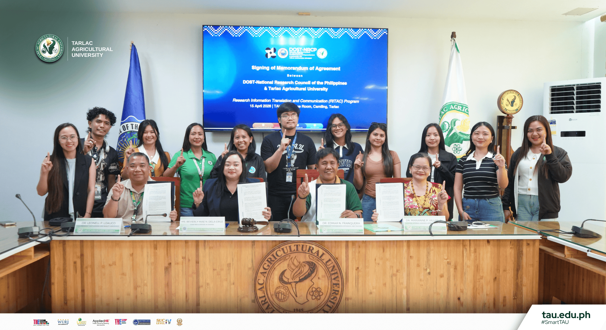 The Tarlac Agricultural University (TAU) and the Department of Science and Technology - National Research Council of the Philippines (DOST-NRCP) formalize their partnership for research communication through a ceremonial signing of Memorandum of Agreement (MOA) at the Office of the University President (OUP) Conference Hall on 15 April.