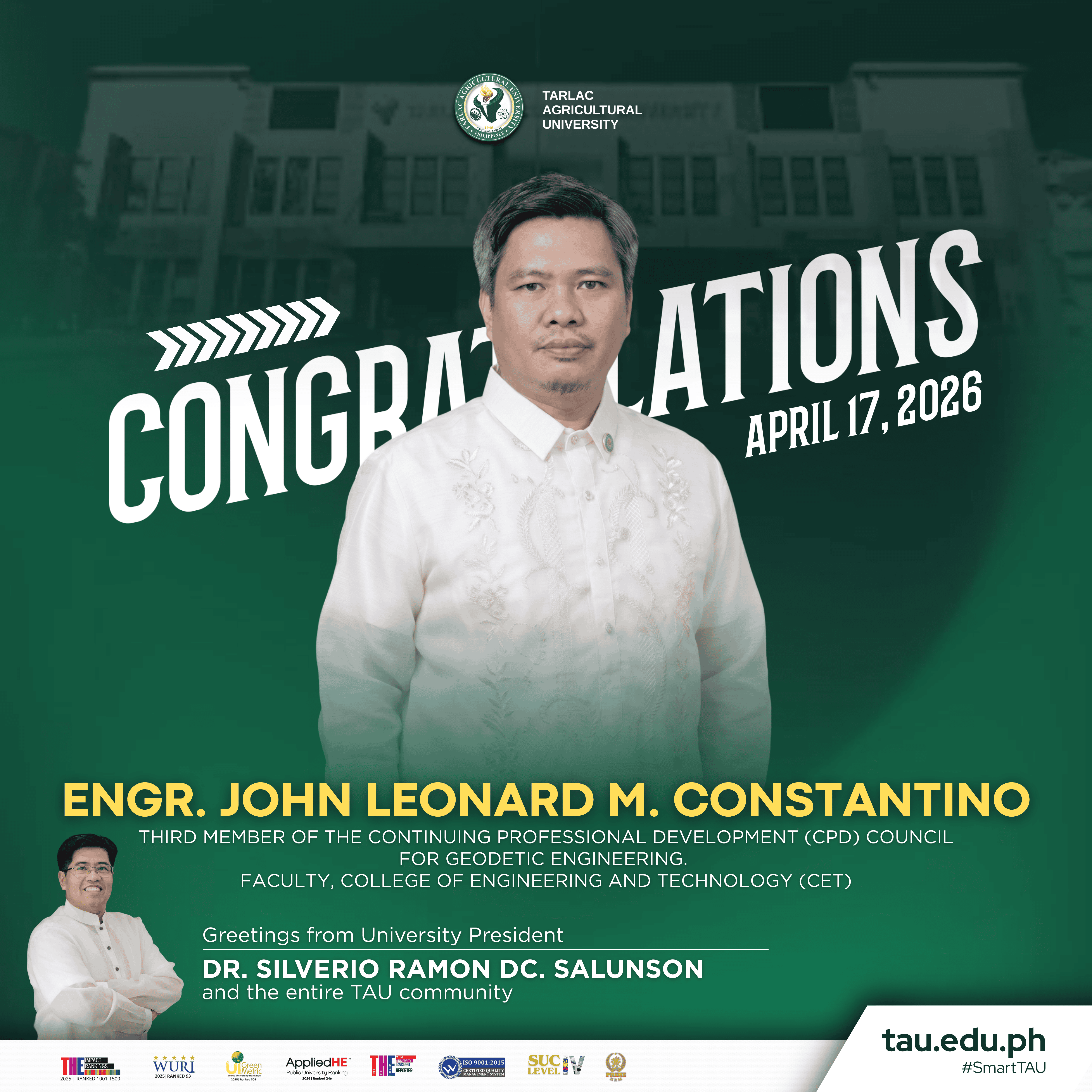 The Tarlac Agricultural University (TAU) community extends a warm and heartfelt congratulations to Engr. John Leonard M. Constantino, faculty from the College of Engineering and Technology (CET), on his formal oath-taking as the third member of the Continuing Professional Development (CPD) Council for Geodetic Engineering.ย