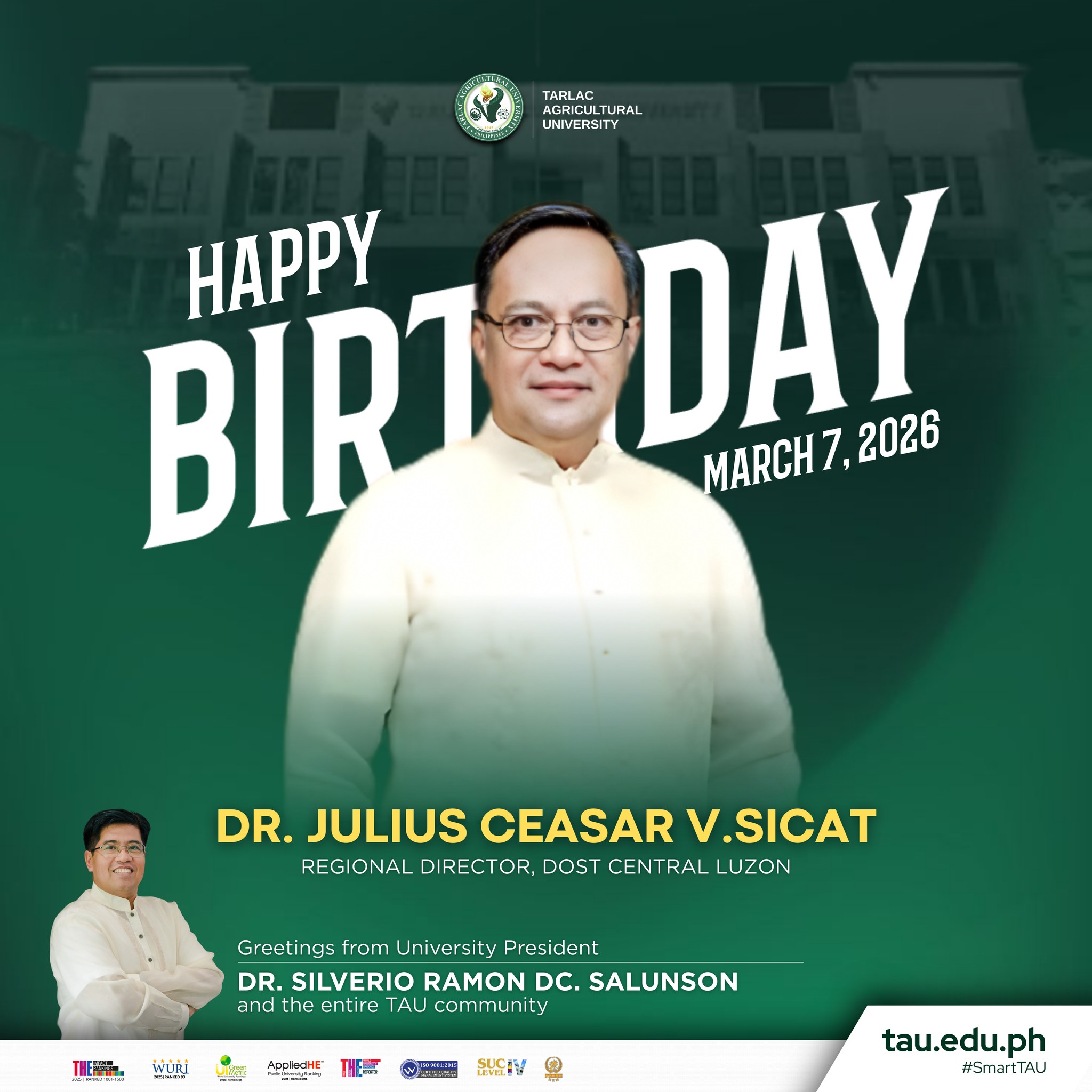 The Tarlac Agricultural University (TAU) community extends its warmest and most heartfelt birthday greetings to Dr. Julius Caesar V. Sicat, Regional Director of the Department of Science and Technology (DOST) III. On this special day, we celebrate your role as a catalyst for innovation, whose leadership has provided the energy that has driven TAUโs research and technological breakthroughs.