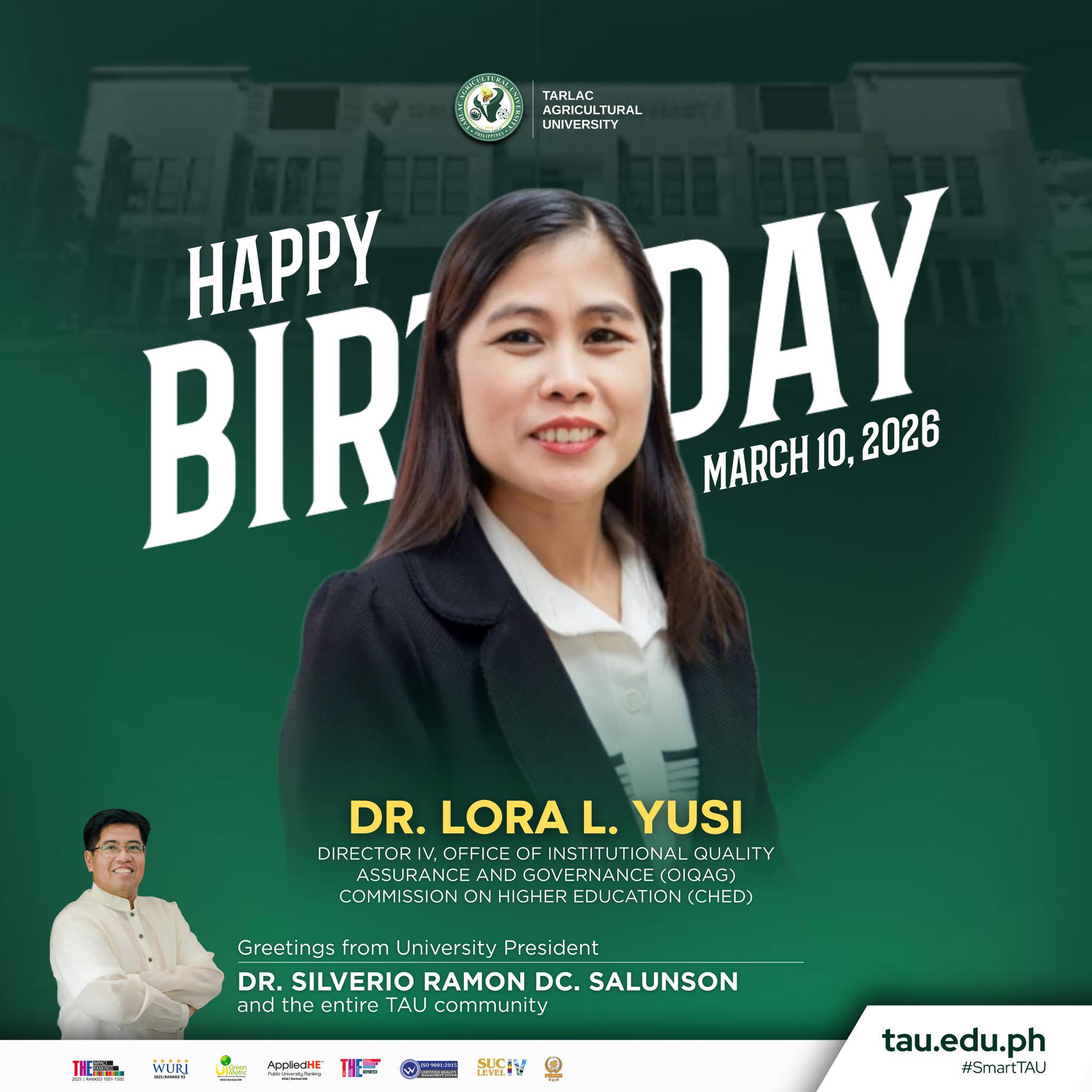 The Tarlac Agricultural University (TAU) community extends its warmest birthday greetings to Dr. Lora L. Yusi, Director IV of the Office of the Institutional Quality Assurance and Governance (OIQAG), Commission on Higher Education (CHED), as she celebrates her special day today.