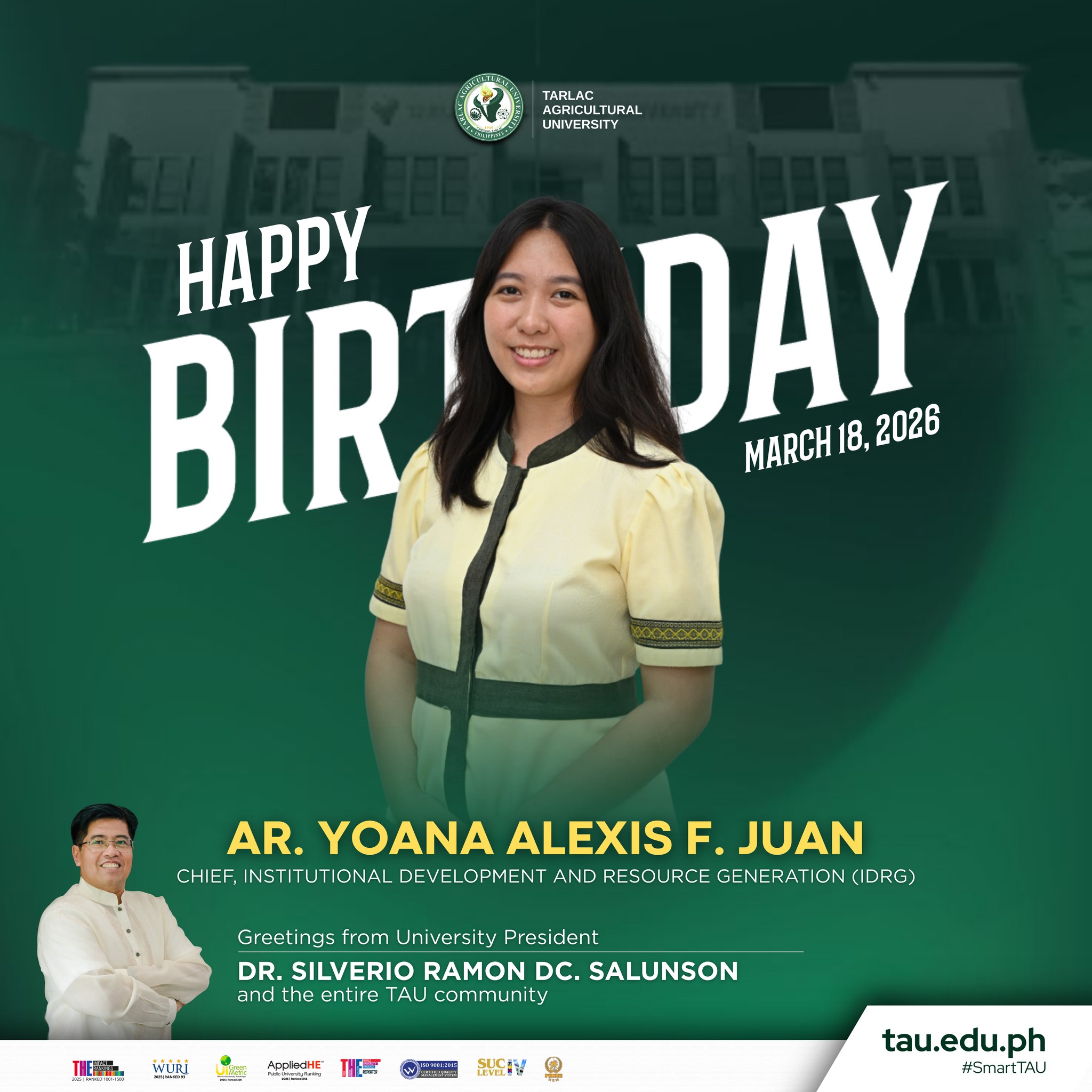 The Tarlac Agricultural University (TAU) community extends its warmest greetings to Ar. Yoana Alexis F. Juan, Chief of the Institutional Development and Resource Generation (IDRG) Unit, on your special day!