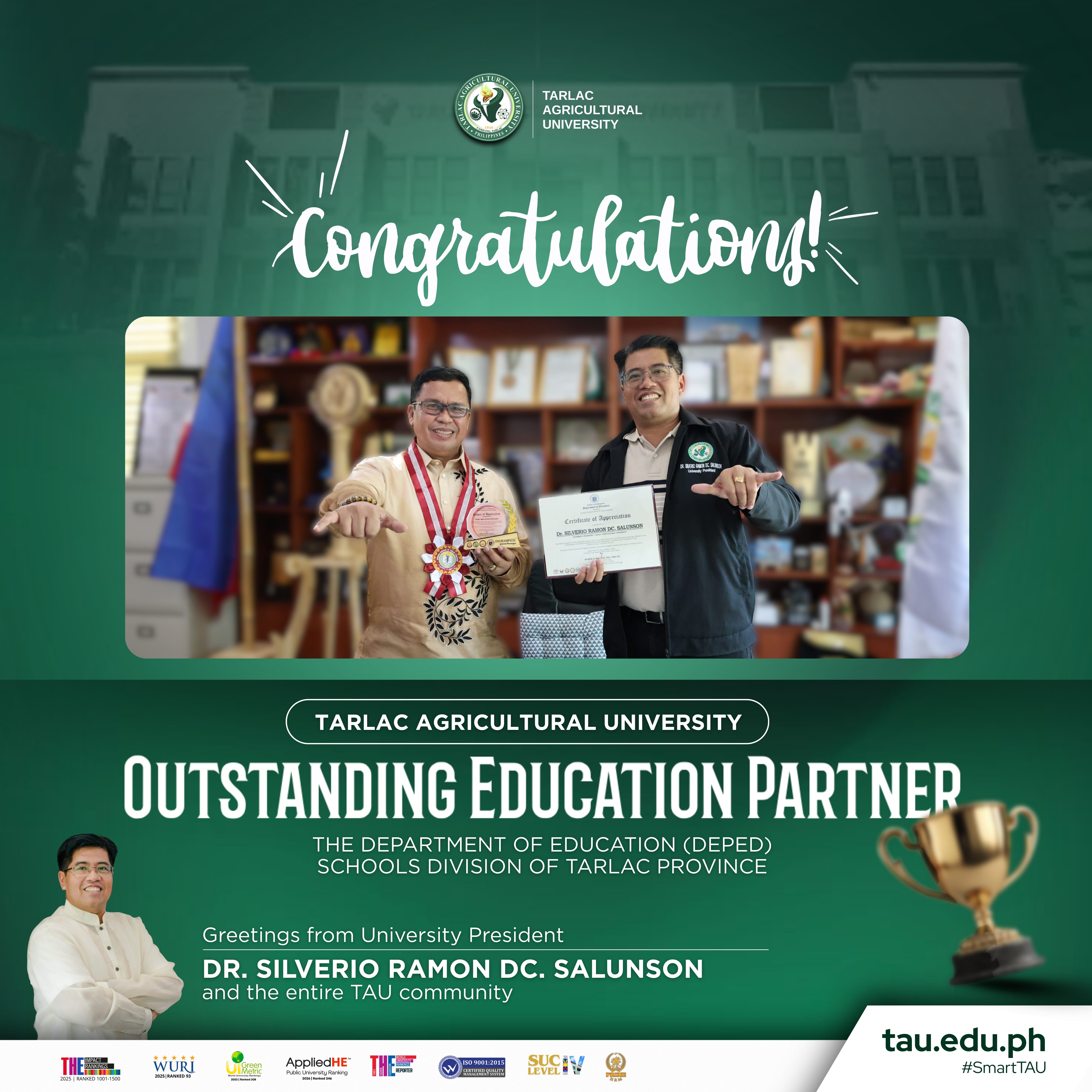 Warmest commendations to Dr. Silverio Ramon DC. Salunson, Tarlac Agricultural University (TAU) President, for being recognized as an ๐๐ฎ๐ญ๐ฌ๐ญ๐๐ง๐๐ข๐ง๐ ๐๐๐ฎ๐๐๐ญ๐ข๐จ๐ง ๐๐๐ซ๐ญ๐ง๐๐ซ by the Department of Education (DepEd) Schools Division of Tarlac Province.ย