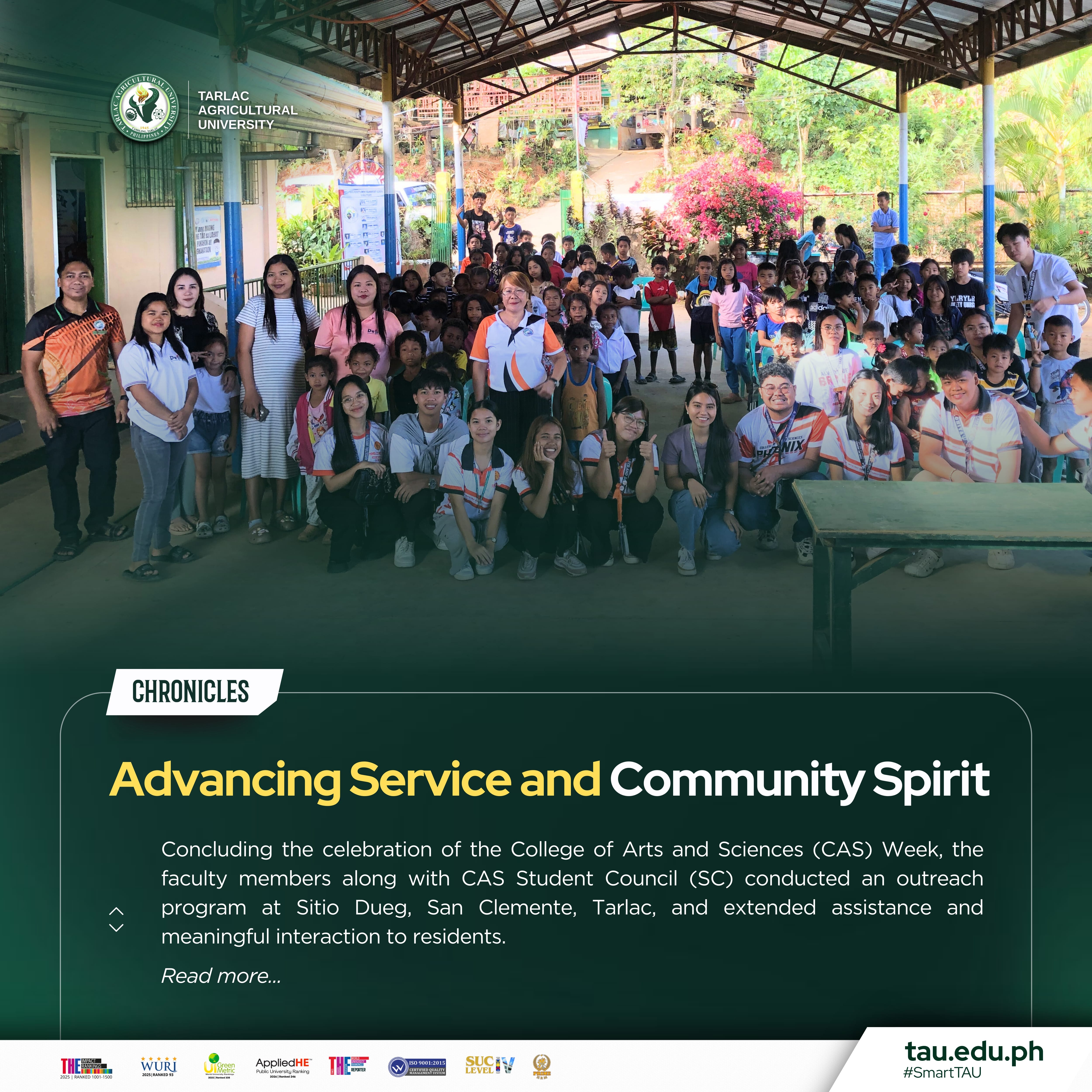 Concluding the celebration of the College of Arts and Sciences (CAS) Week, the faculty members along with CAS Student Council (SC) conducted an outreach program at Sitio Dueg, San Clemente, Tarlac, and extended assistance and meaningful interaction to residents.