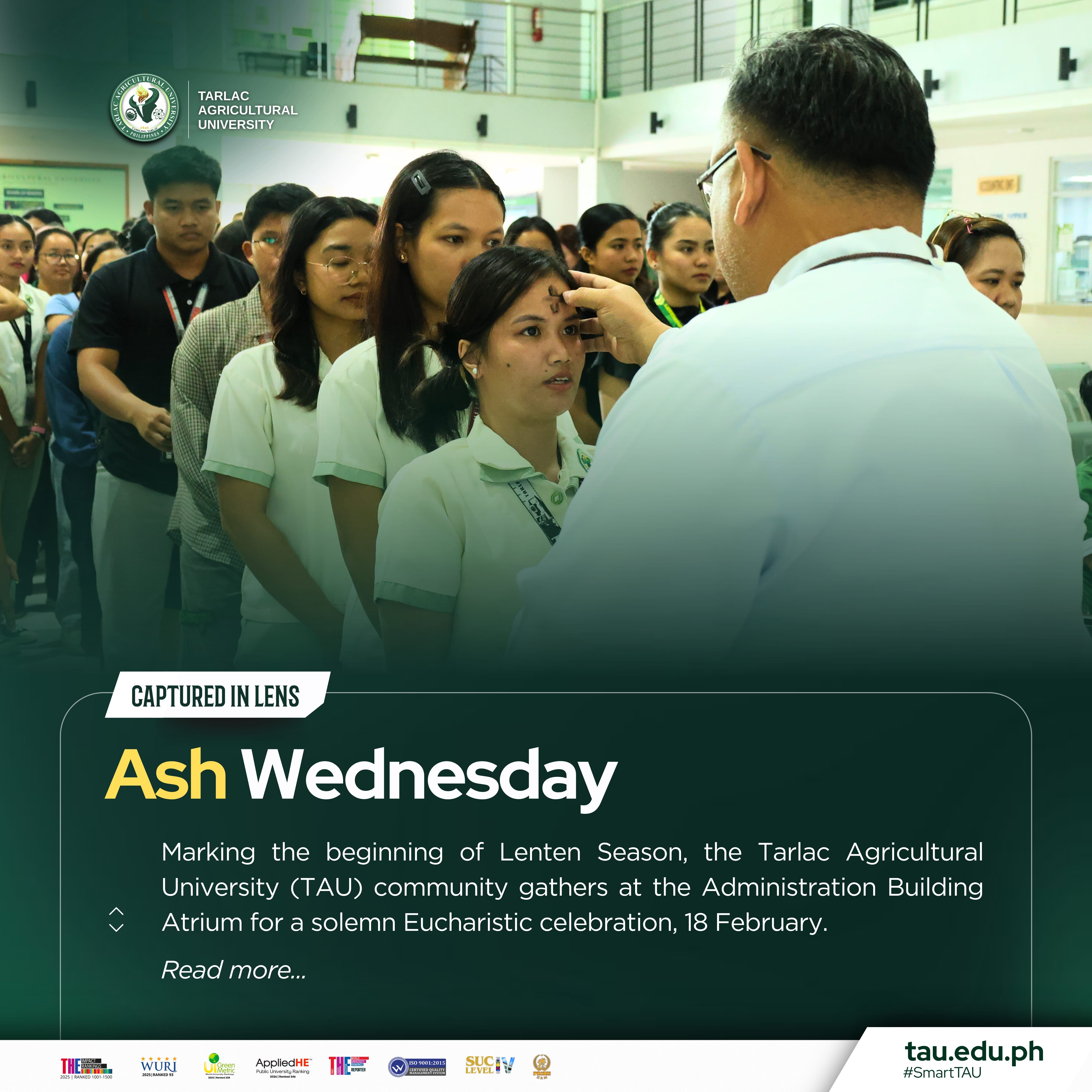 Marking the beginning of the Lenten Season, the Tarlac Agricultural University (TAU) community gathers at the Administration Building Atrium for a solemn Eucharistic celebration, 18 February.